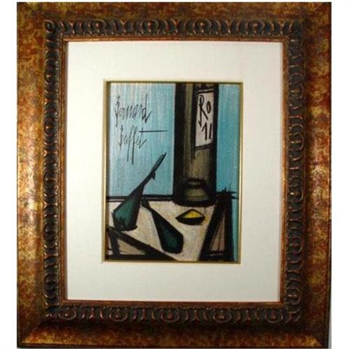 Authentic and Original! Titled: Still Life with Bottle - Printed; Paris, MOURLOT, 1967 Full Image Size 12.25 x 9.5 Image extends to boarder, signed in the plate by the artist. Near mint condition, verso is clean.<p> FRAME SIZE: 25.25 x 22.25 Very nice frame; Custom hand assemble wood frame, using a 4 molding, linen matting beveled to a wood filet, all acid free material, uv glass. <p> Bernard Buffet 1928 - 1999 France French painter, illustrator and printmaker. After studying at the Ecole des Jйsuites, he entered the Lycйe Carnot in Paris in 1939. His antipathy to academic study led to his expulsion in 1943, in which year he attended an evening class in drawing. In December 1943 he gained a place at the Ecole Nationale Supйrieure des Beaux-Arts in Paris, working in the studio of Eugиne Narbonne (b 1885). On leaving the Ecole des Beaux-Arts in 1945 he travelled to Brittany with his mother, but after her sudden death he returned to Paris, where he devoted himself to painting. He then moved to Massy-Palaiseau, just south of Paris, to work with his friend Robert Mantienne, a French painter, and painted the Deposition from the Cross (c. 1945; Paris, Pompidou). This early work, with its restrained grey-toned colours and gaunt, anxious human figures, already bears many of the hallmarks of his later painting; both in spirit and colouring it shows the influence of Francis Gruber. In 1946 he met the writer Pierre Descargues, who became one of his earliest and most ...