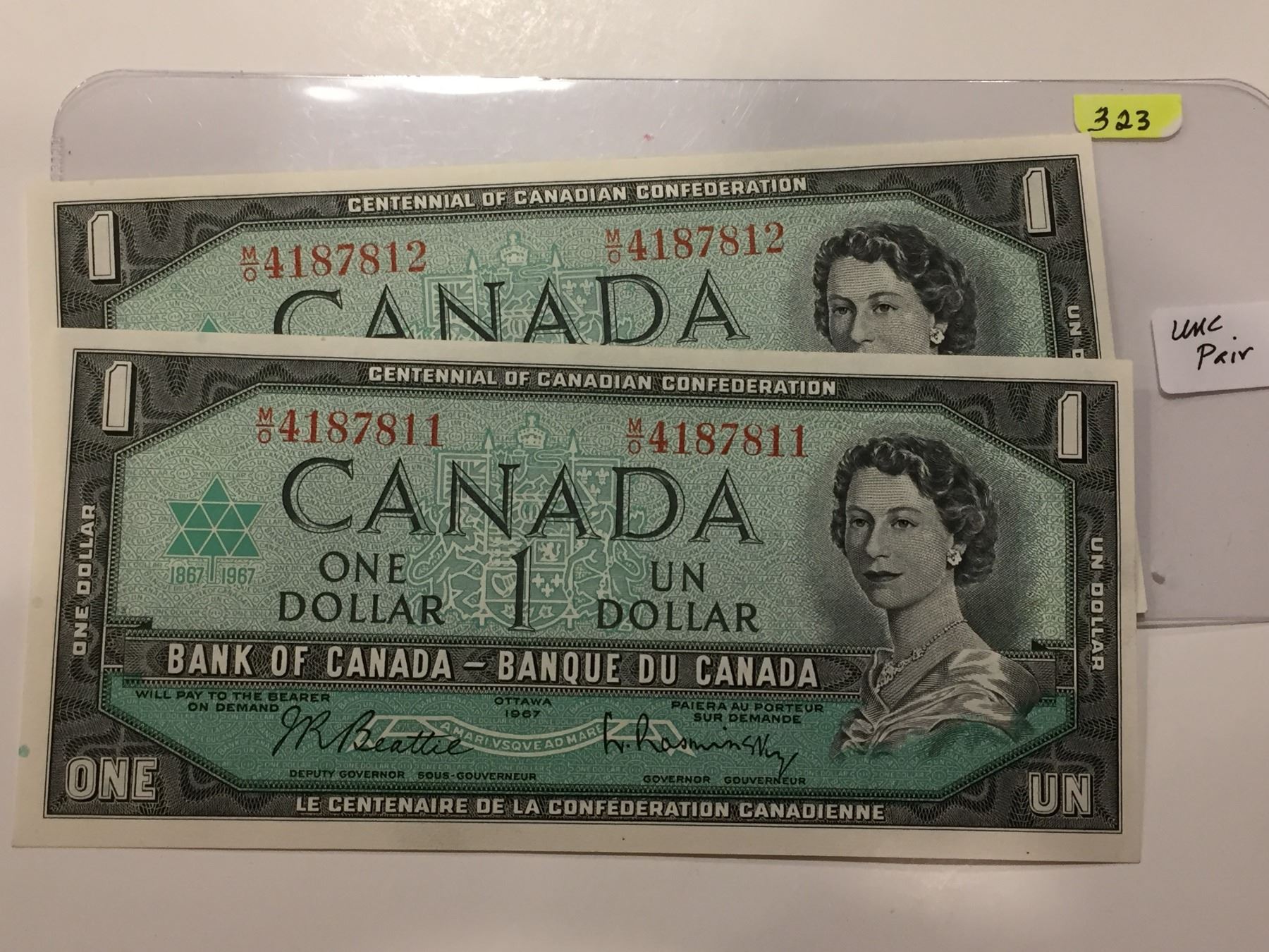 1967 Bk of Canada Centennial One Dollar Bill - Consecutive Pr. - Uncirc.