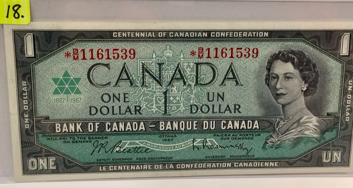 1967 Bk of Canada One Dollar Bill; Beattie/Rasminsky; SN *B/M 1161539 Replacement