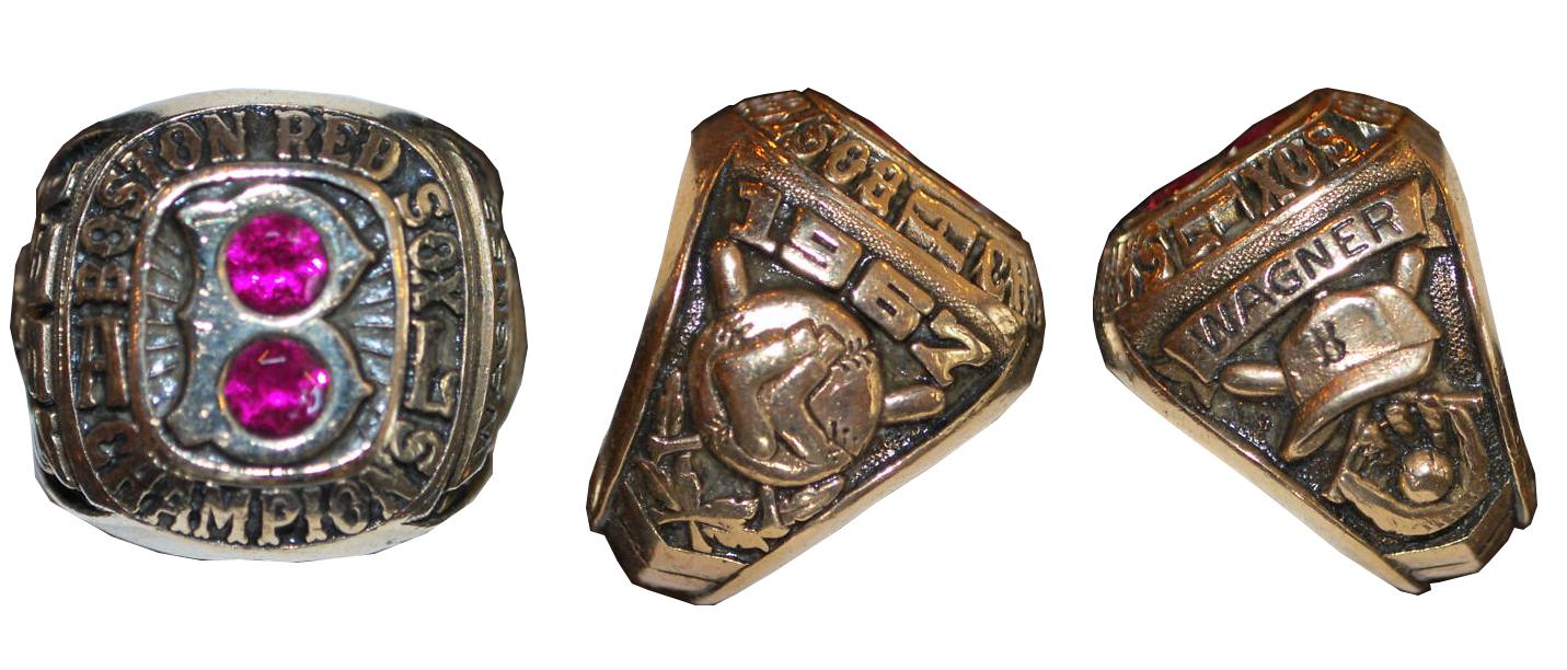 1967 Boston Red Sox American League Championship 10 karat gold ring belonging to ''Broadway'' Charlie Wagner who spent 77 years with the Boston Red Sox, as a player, scout, and coach. Two rubies are embedded in the capital letter ''B'' which is the centerpiece of the ring. Size 8 ring weighs 31 grams, made by Balfour. Very rare piece of Red Sox memorabilia with exceptional association.