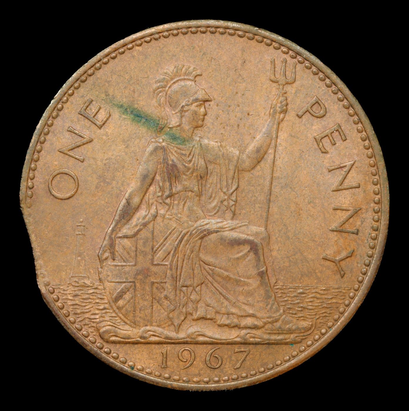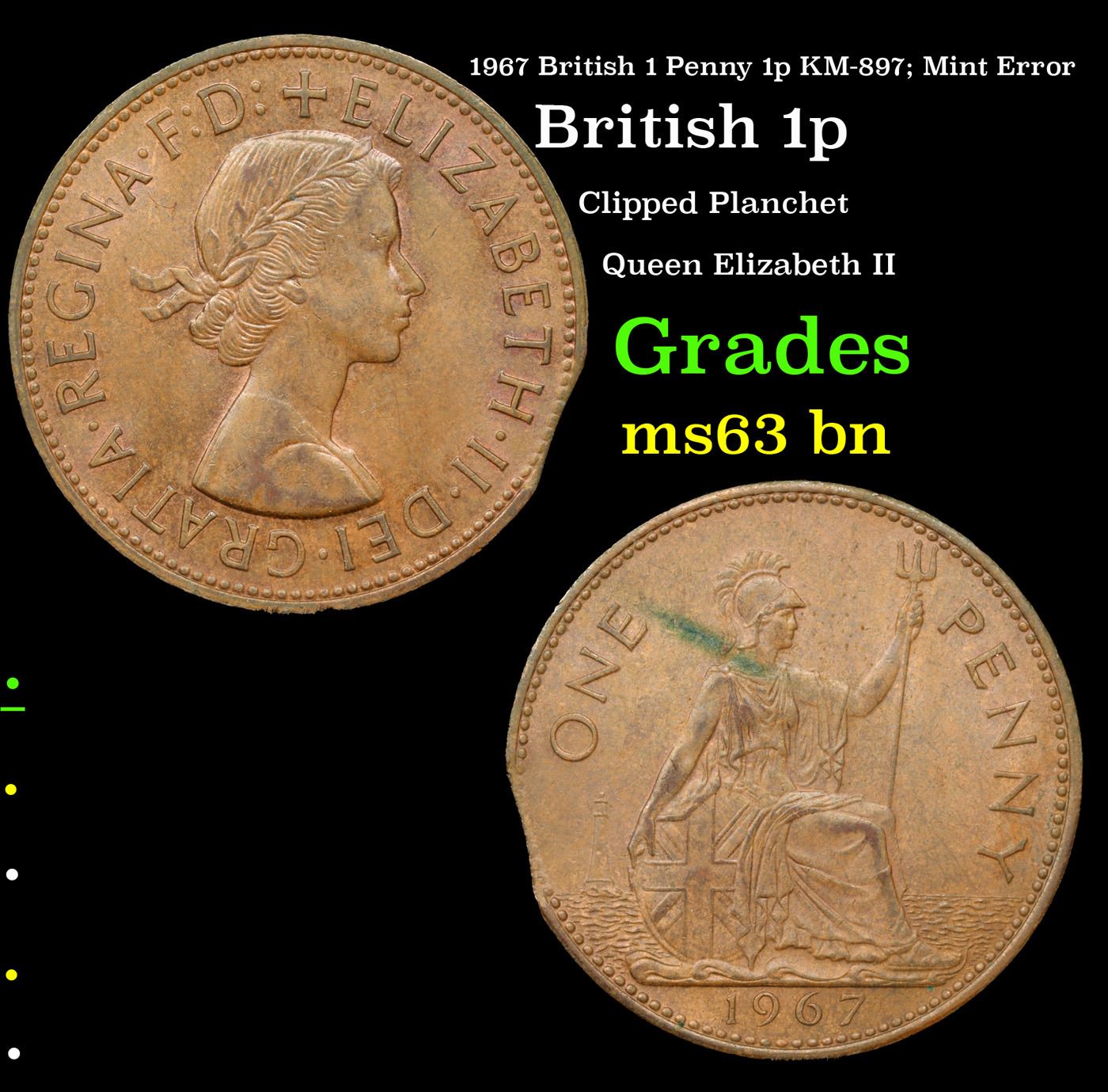 1967 British 1 Penny 1p KM-897; Mint Error Grades Select Unc BN. Elizabeth was born in Mayfair, London, as the first child of the Duke and Duchess of York (later King George VI and Queen Elizabeth). Her father acceded to the throne in 1936 upon the abdication of his brother, King Edward VIII, making Elizabeth the heir presumptive. She was educated privately at home and began to undertake public duties during the Second World War, serving in the Auxiliary Territorial Service. In November 1947, she married Philip Mountbatten, a former prince of Greece and Denmark, and their marriage lasted 73 years until Philip's death in 2021. They had four children: Charles, Prince of Wales; Anne, Princess Royal; Prince Andrew, Duke of York; and Prince Edward, Earl of Wessex.When her father died in February 1952, Elizabeth—then 25 years old—became queen regnant of seven independent Commonwealth countries: the United Kingdom, Canada, Australia, New Zealand, South Africa, Pakistan, and Ceylon, as well as Head of the Commonwealth. Elizabeth has reigned as a constitutional monarch through major political changes such as the Troubles in Northern Ireland, devolution in the United Kingdom, the decolonisation of Africa, and the United Kingdom's accession to the European Communities and withdrawal from the European Union. The number of her realms has varied over time as territories have gained independence, and as some realms have become republics. Her many historic visits and meetings include state visits to the People's Republic of China in 1986, the Russian Federation in 1994, the Republic of Ireland in 2011, and visits to or from five popes.Significant events have included Elizabeth's coronation in 1953 and the celebrations of her Silver, Golden, Diamond and Platinum jubilees in 1977, 2002, 2012, and 2022, respectively. Elizabeth is the longest-lived and longest-reigning British monarch, the oldest and longest-serving incumbent head of state, and the second-longest reigning sovereign monarch in world history. She has faced occasional republican sentiment and press criticism of the royal family, particularly after the breakdown of her children's marriages, her annus horribilis in 1992, and the death in 1997 of her former daughter-in-law Diana, Princess of Wales. However, support for the monarchy in the United Kingdom has been and remains high, as does her personal popularity.