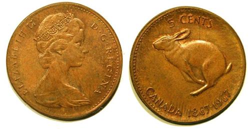 Scarce Centennial commemorative 5 cent struck on copper Penny Planchet. Copper Rabbit.