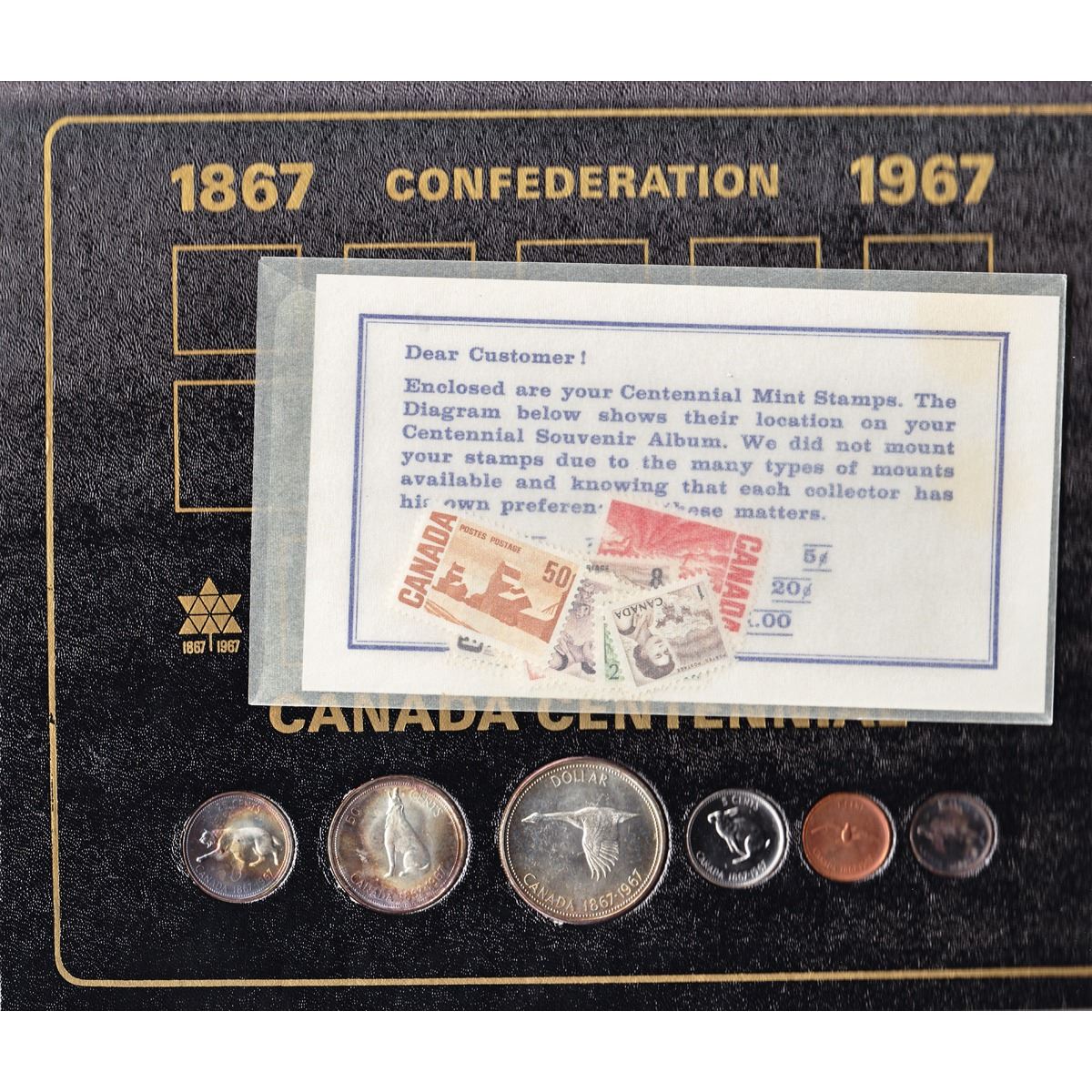 1967 Canada Centennial 6-coin Silver Decimal Set with Stamps in Decorative Folder. Buyers Premium will be added on all items as per our terms of sale. We accept Paypal, Credit Card, E-Transfer Payments, Cheque or Money Orders (there is an additional 3% fee for using Paypal or Credit Card). All invoices will be emailed immediately following the auction, please contact us if you would like to pay by credit card or receive a new revised lower total for mailing in payment or sending an e-transfer (3% discount). All Items Are Sold "AS IS", no returns