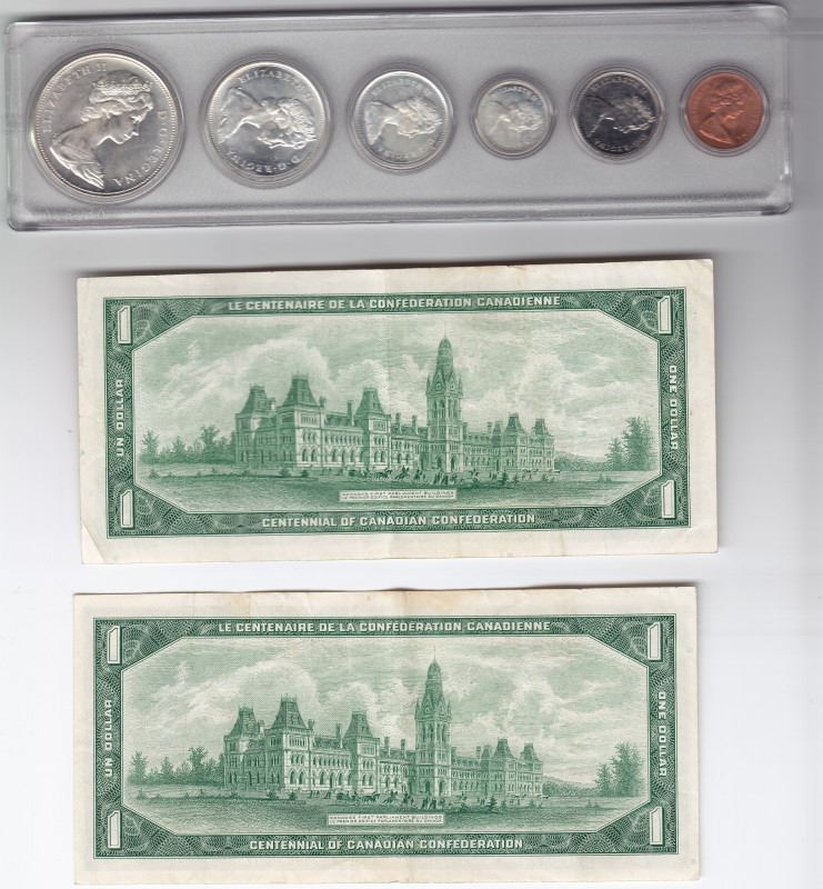 1 x 1967 Canada Coin Set In Holder & 2 1967 Bank Of Canada $1 Dollar Bank Notes - Beattie / Rasminsky