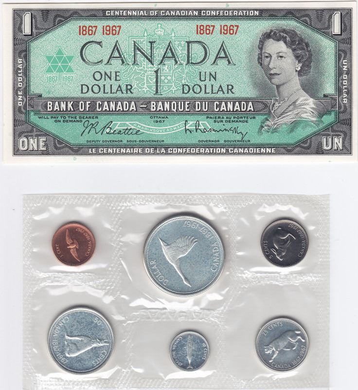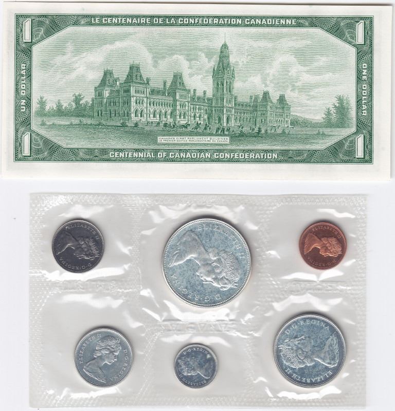 1 x 1967 Canadian Mint Coin Set In Hard Plastic Case & $1 Commemorative Centennial Bank Note
