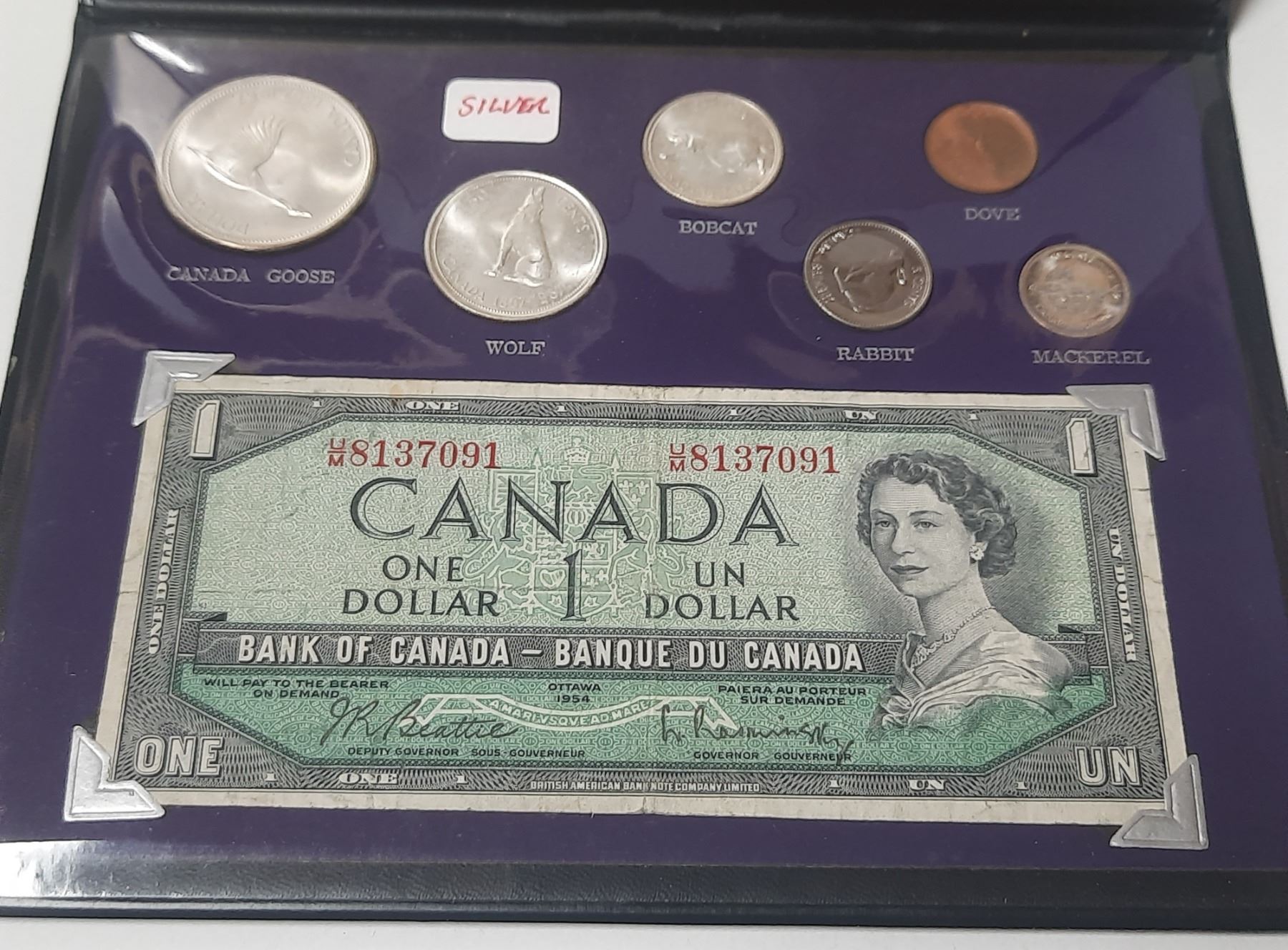 1967 Canadian Centennial Silver Coin Set and 1954 Canadian One Dollar Banknote.