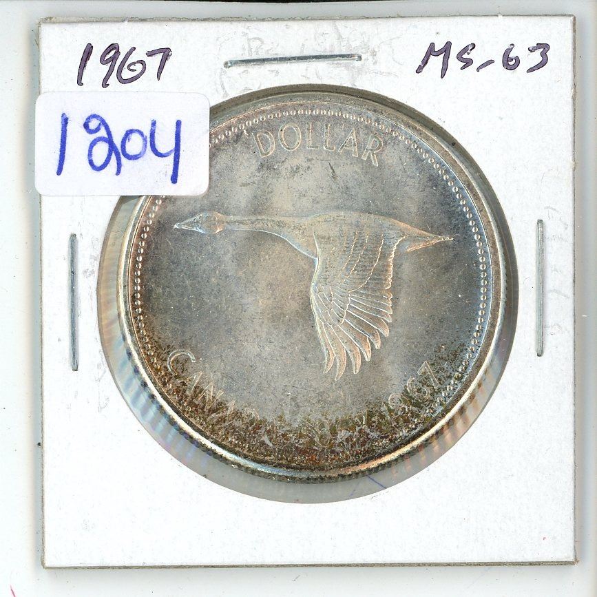 1967 Canadian Silver Dollar. One year type. MS-63. Nicely Toned.