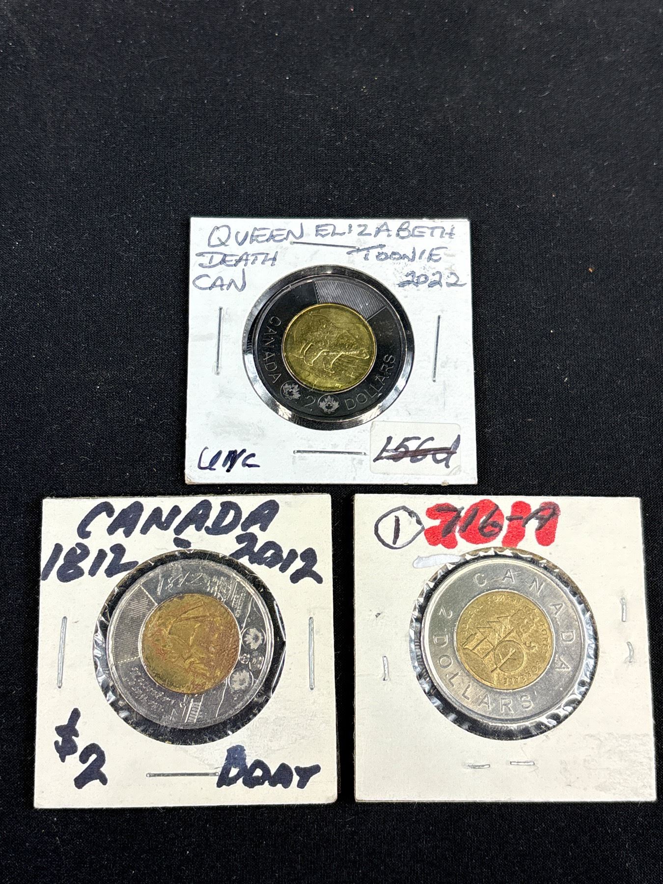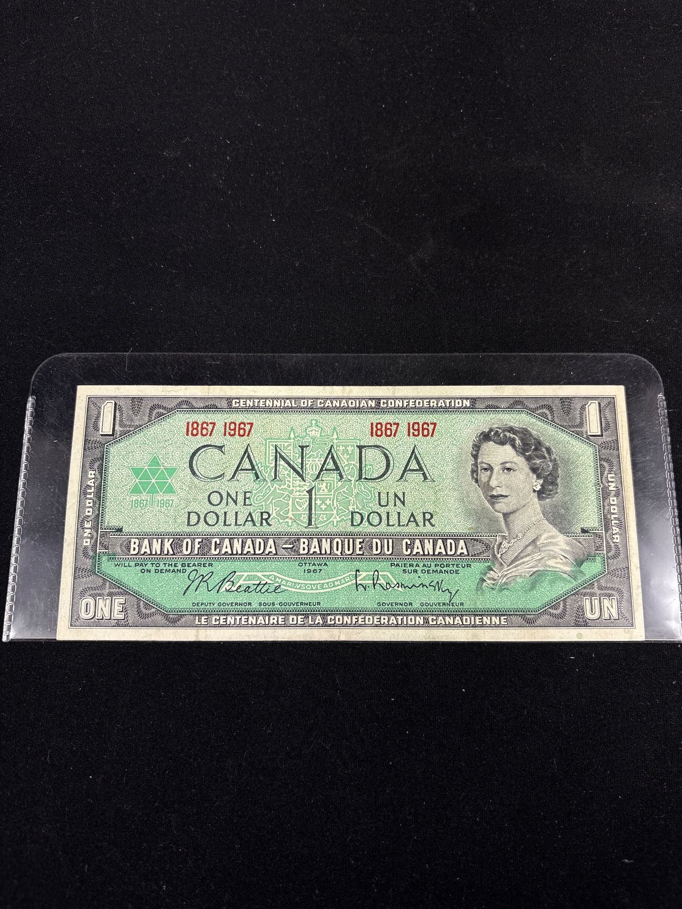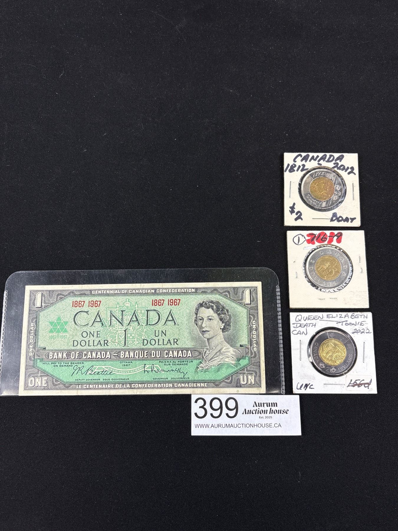 1967 Centenial $1 Bank Note + 3 Collectible Toonies