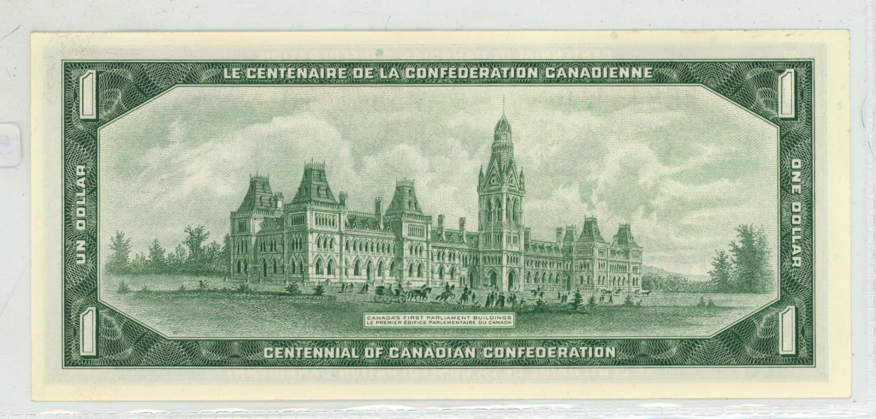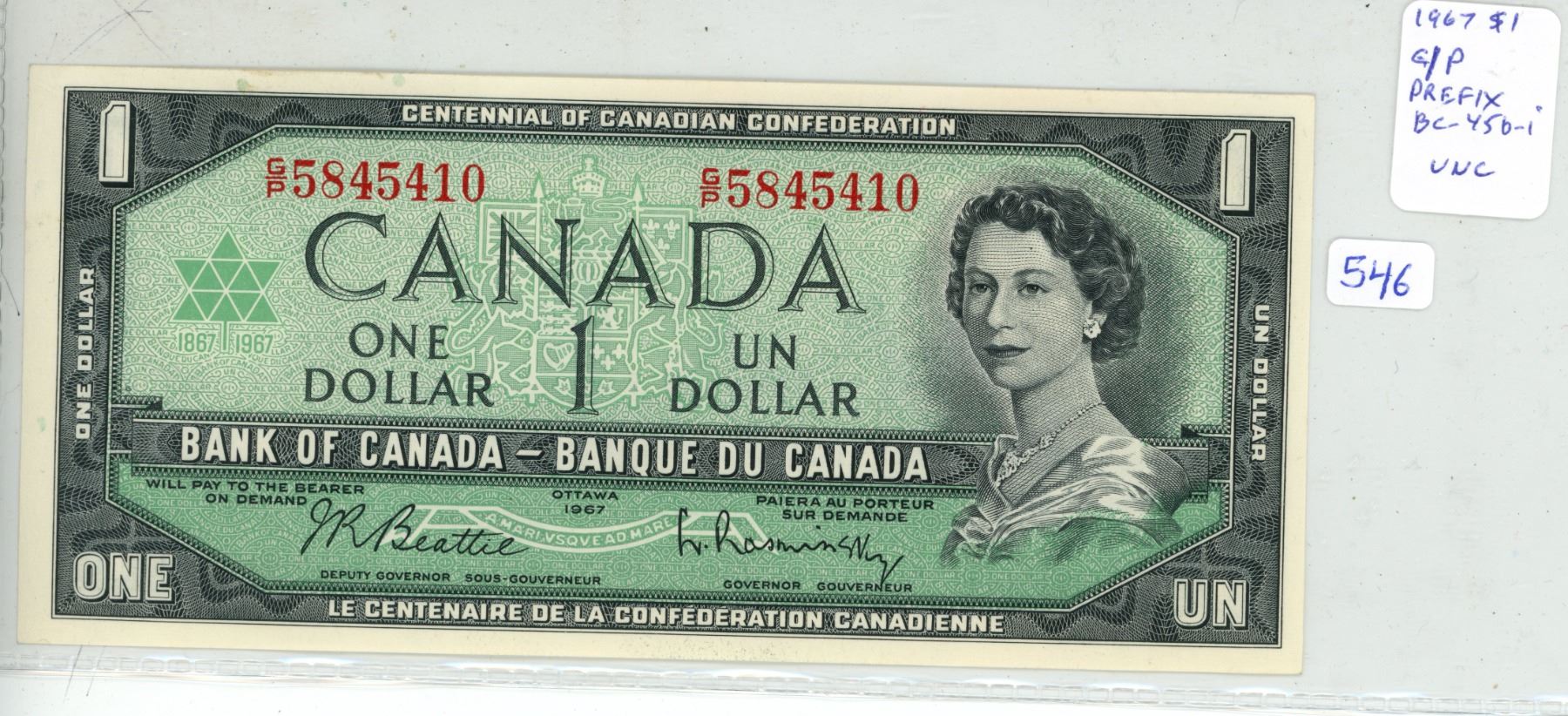 1967 Centennial $1. Beattie-Rasminsky signatures. With Serial Numbers. G/P Prefix. BC-45b-i. Choice Uncirculated.