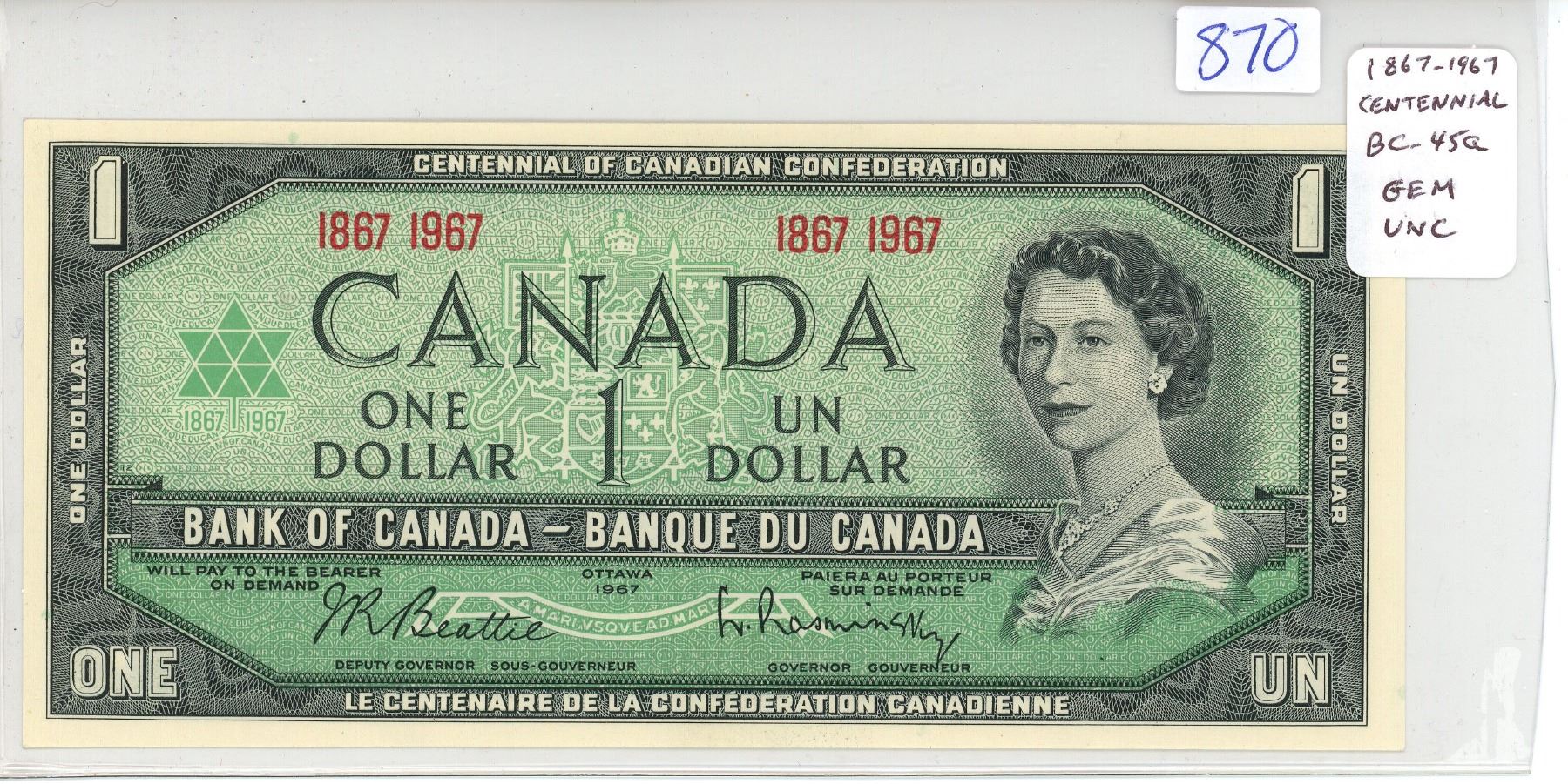 1967 Centennial $1 note. No Serial Number. Instead, dual dates 1867 1967. BC-45a. Gem Uncirculated.