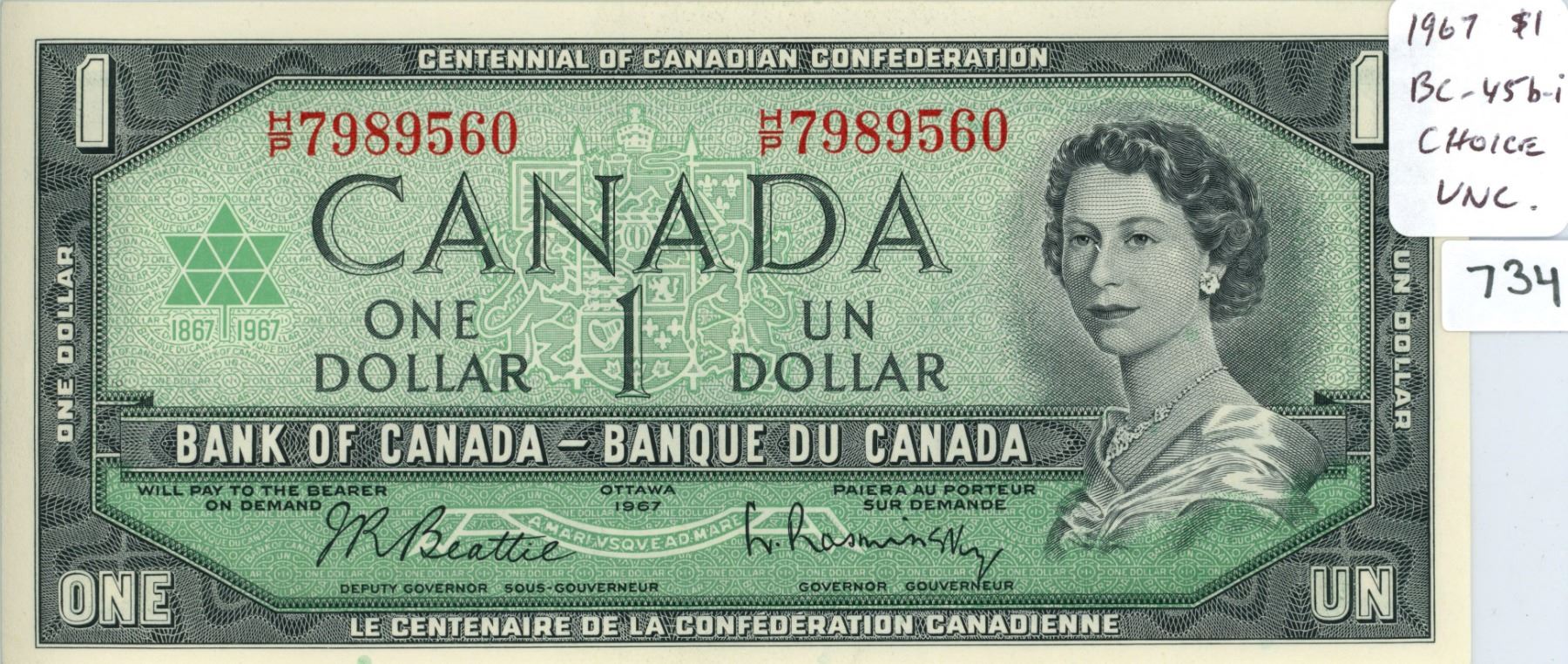 1967 Centennial $1 with Serial Numbers. Beattie-Rasminsky signatures. BC-45b-i. Choice Uncirculated.