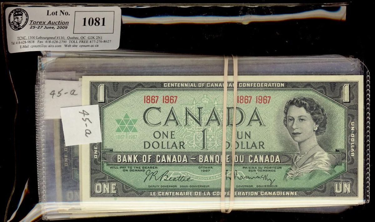 1967 Centennial and 1973 $1. Lot of 33 Banknotes, includes BC-45a (3), BC-45bA-i, BC-46a (3), BC-46aA below, BC-46aA *AL, BC-46aA *AN, BC-46aA-i, BC46b (13), BC-47a (4), BC-47a-i, BC48b, BC-51b, BC-53a and BC-53b. VG to AU