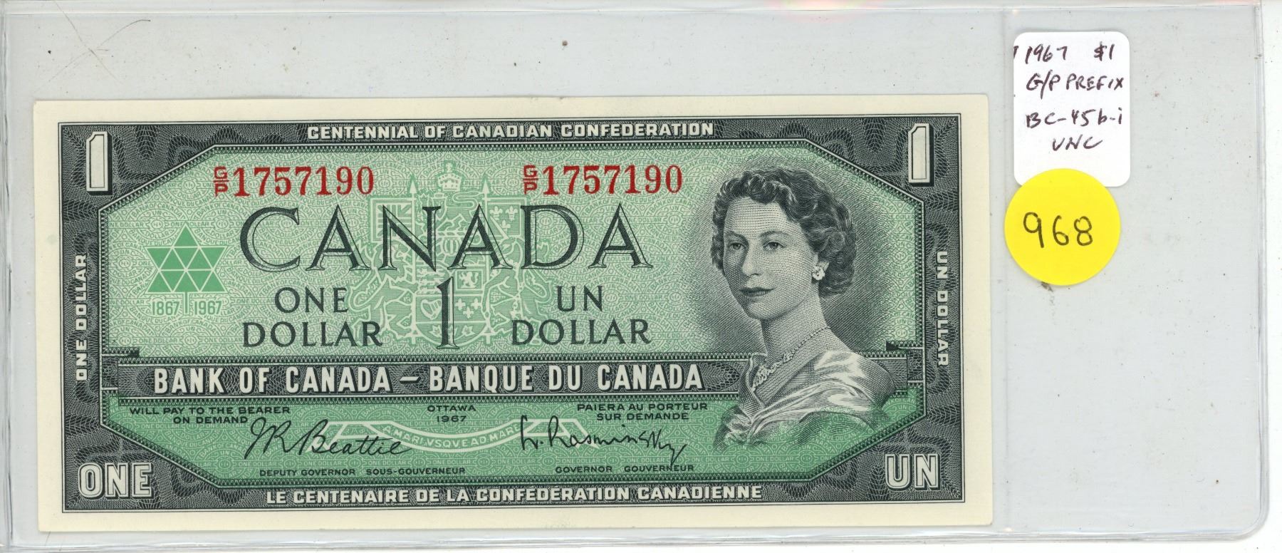 1967 Centennial of Canadian Confederation $1 with Serial Numbers. G/P Prefix. BC-45b-i. Uncirculated.