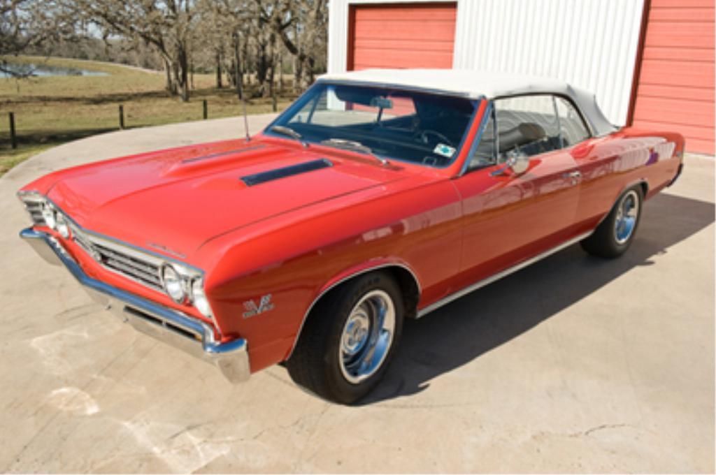 1967 Chevrolet Chevelle SS-396 Convertible 396 cid overhead valve V8 engine rated at 325 horsepower, four-speed manual transmission, coil spring independent front suspension, live rear axle with leaf springs, four-wheel power disc brakes; wheelbase: 115Ô-By the mid-Ñ60s, street and strip racing filled the minds of young drivers across America, and dealerships rolled muscle cars out the door as fast as the factories could make them. Each automobile manufacturer had its own approach to satisfy, and ultimately win, new buyers. The Super Sport name had become synonymous with performance on Chevys, and in 1967 it was possible to have the power and great styling in a mid-sized Chevelle. This big-block Chevelle must have started life as a very fun and exciting car. While the exterior visually tells a performance story with the raised scoop Super Sport hood and 396 fender badges, the convertible folding top and bench seat suggests fun in the sun with room for the whole gang! As a true SS396 with VIN prefix 13867, this convertible represents serious investment potential. The 1967 models are among the most sought-after Chevelles, and this fire