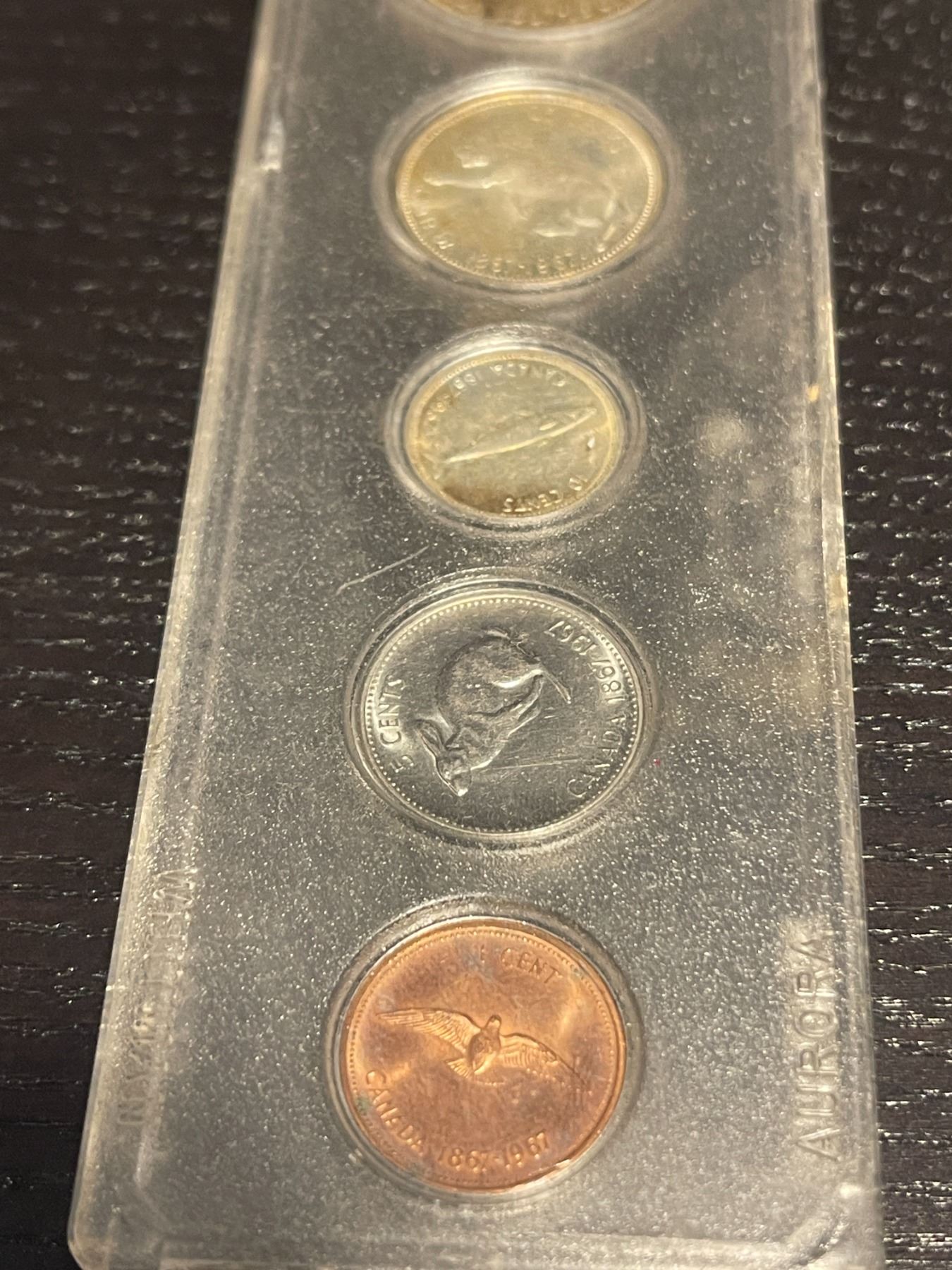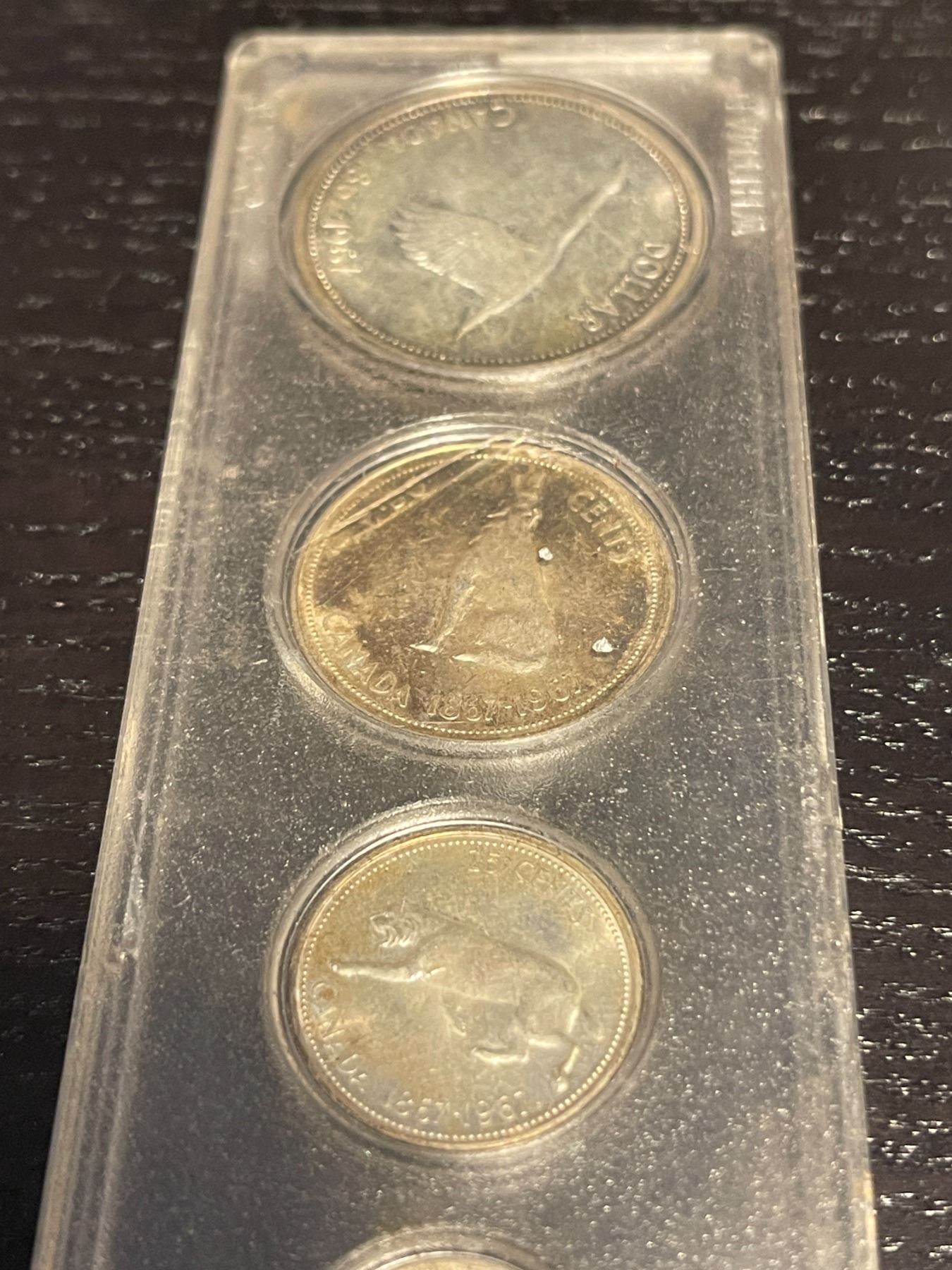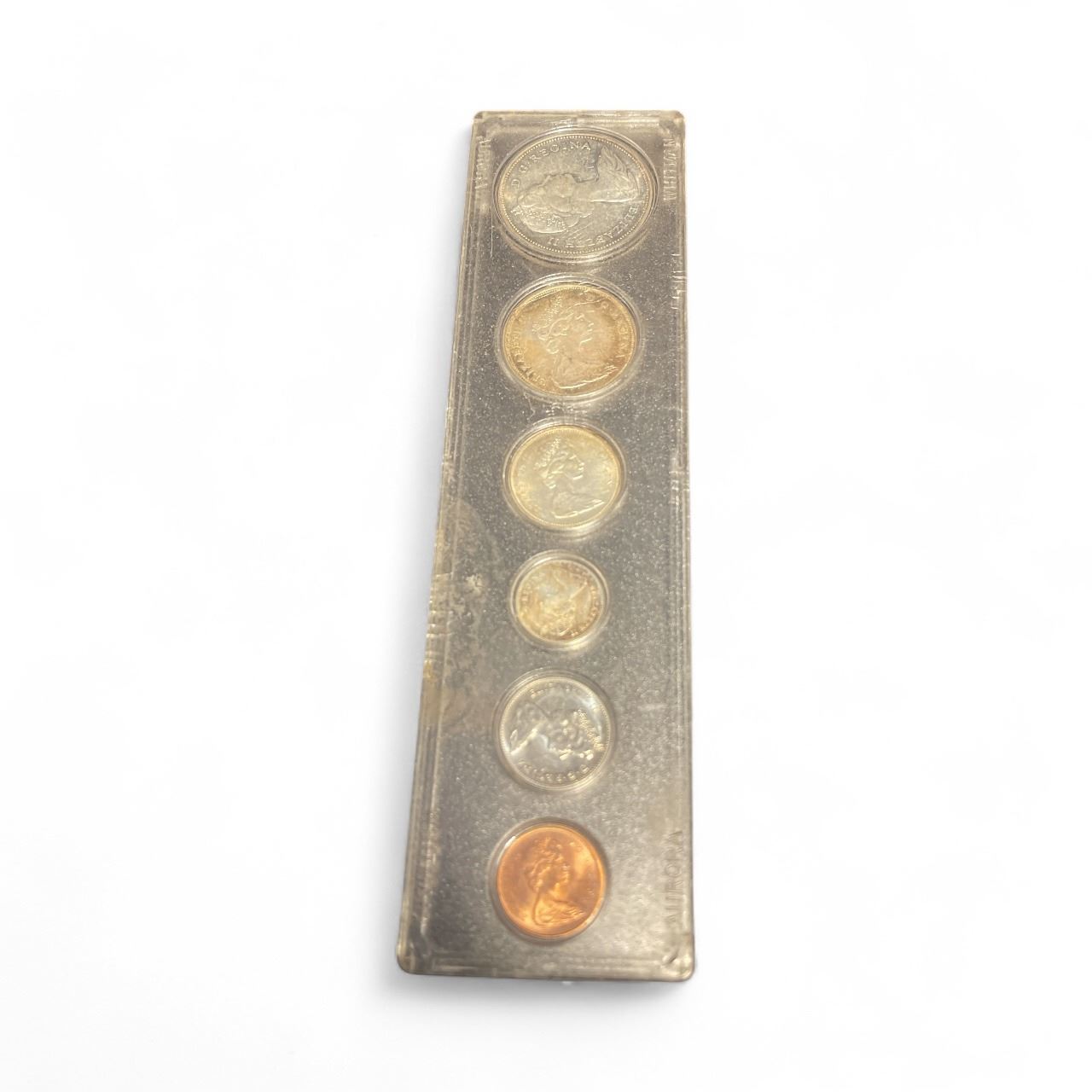 1967 Circulated Canadian 6 Coin Set in Holder - The 50¢ and $1 coins are .800 Silver, and the 25¢ and 10¢ are .500 silver