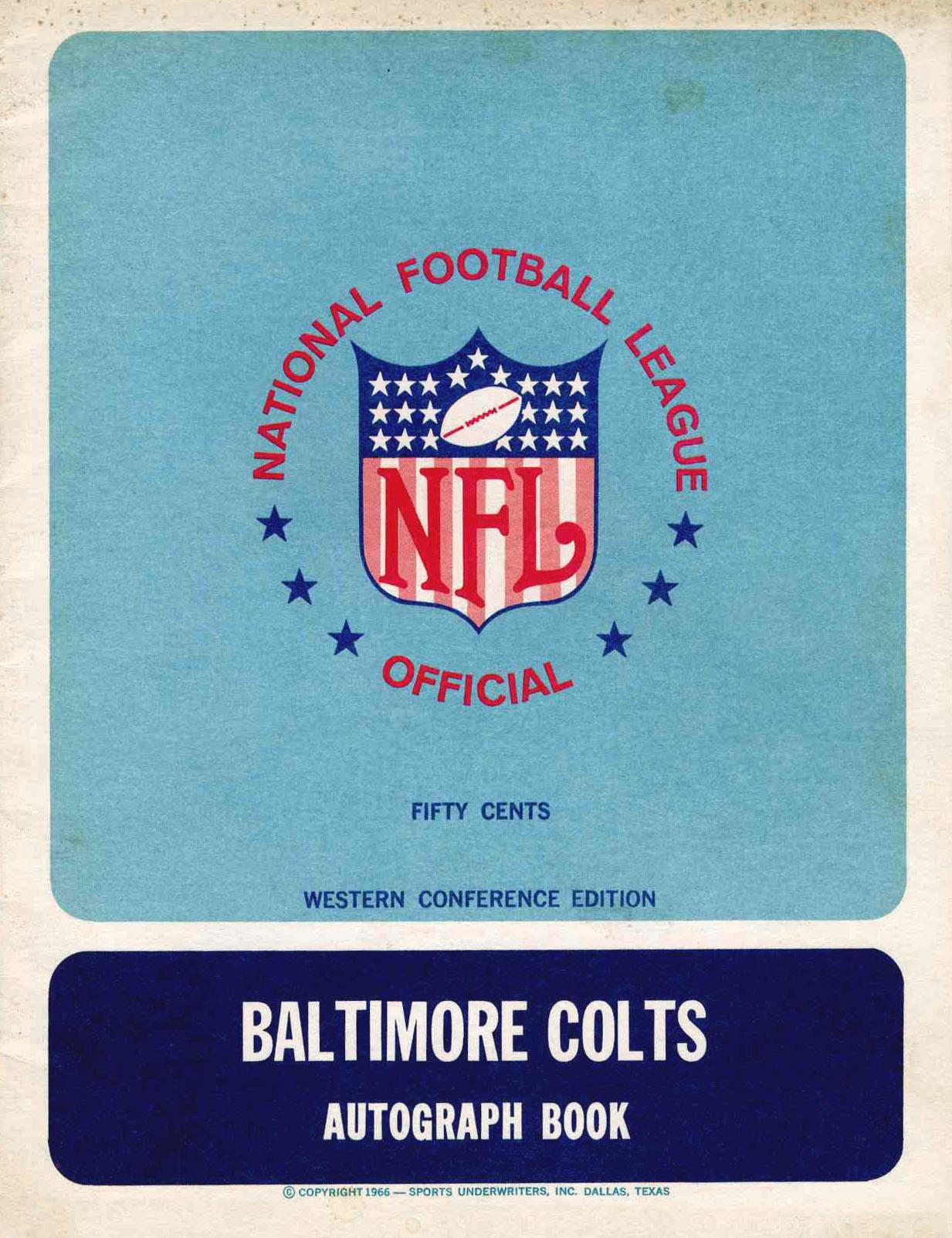 1967 Baltimore Colts NFL autograph book. Features Baltimore Colts roster including John Unitas, headshots of all starting players in the Western Conference and period advertisements. Softcover booklet measures 8.5'' x 11'' and runs 36pp. Light toning, foxing and smudges, otherwise very good.