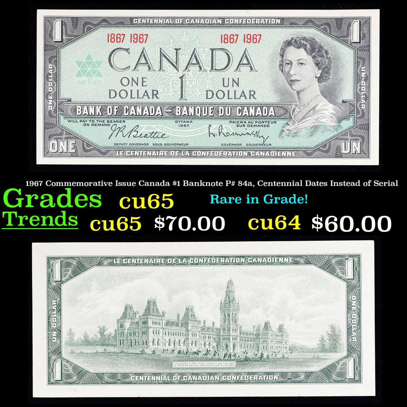 1967 Commemorative Issue Canada $1 Banknote P# 84a, Centennial Dates Instead of Serial Grades Gem CU