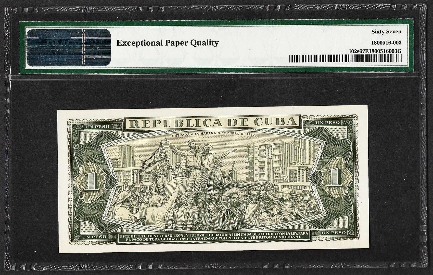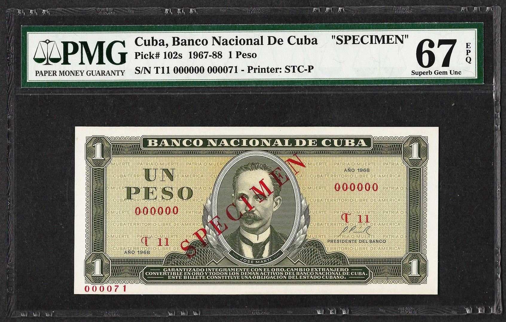 One 1967 Cuba Un Peso National Bank of Cuba Specimen Note PMG Superb Gem Uncirculated 67EPQ. PMG Certified.