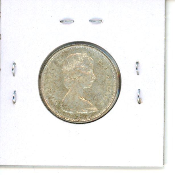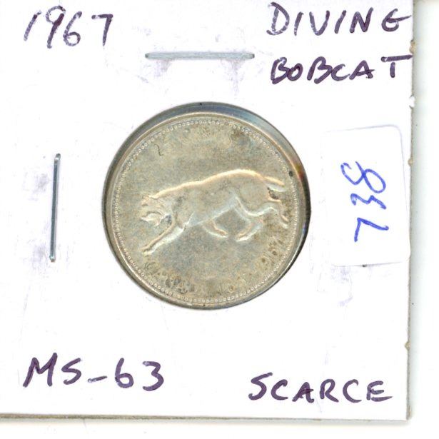 1967 Diving Bobcat Canadian Silver 25 Cents. There is a Die Rotation, so it looks like the Bobcat is Diving. MS-63. Scarce.