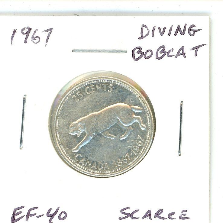 1967 Diving Bobcat Canadian Silver 25 Cents. There is a Die Rotation, so it looks like the Bobcat is Diving. EF-40.