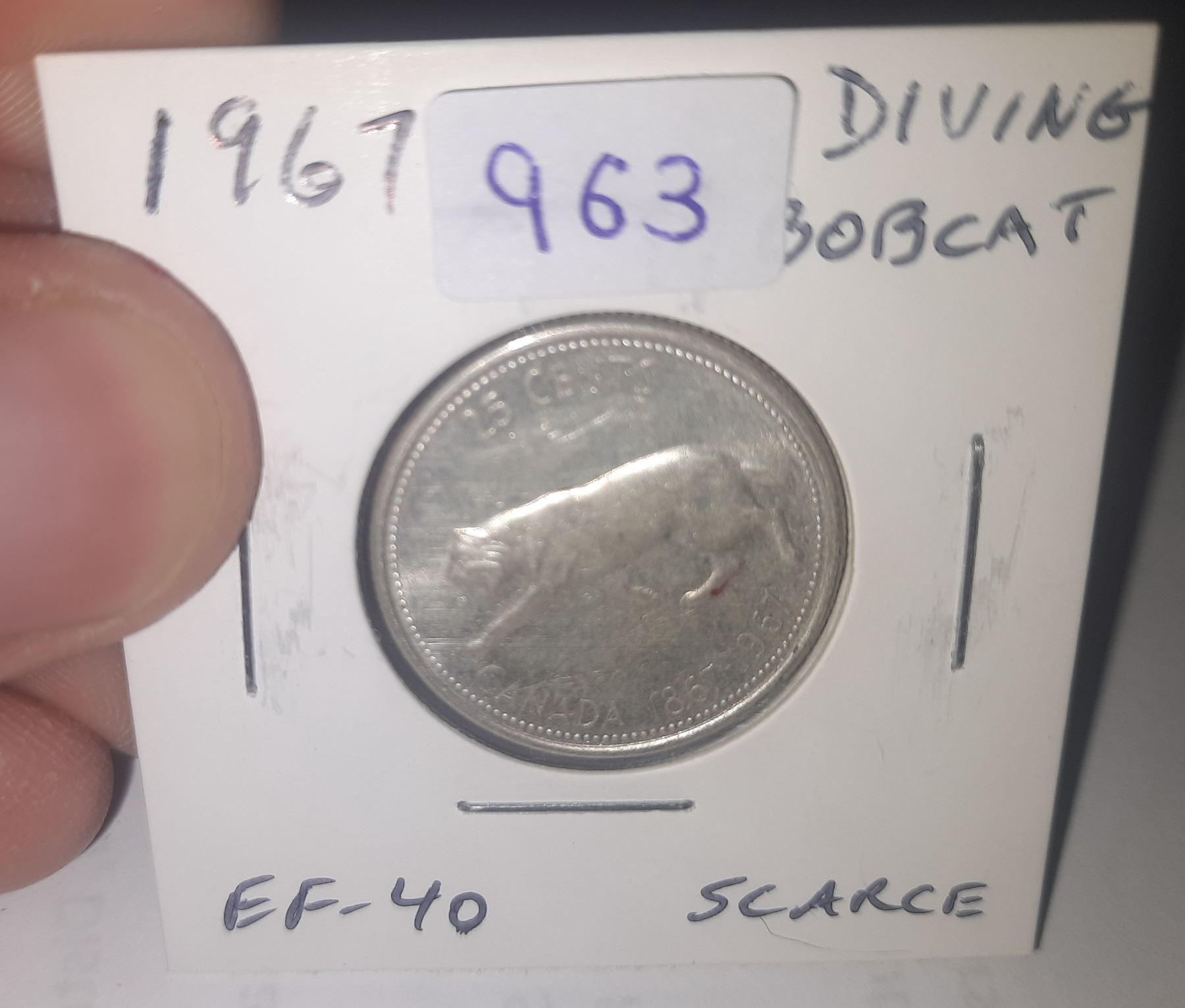 1967 Diving Bobcat Silver 25 Cents. Die Rotation so it appears that the Bobcat is Diving. EF-40. Scarce.