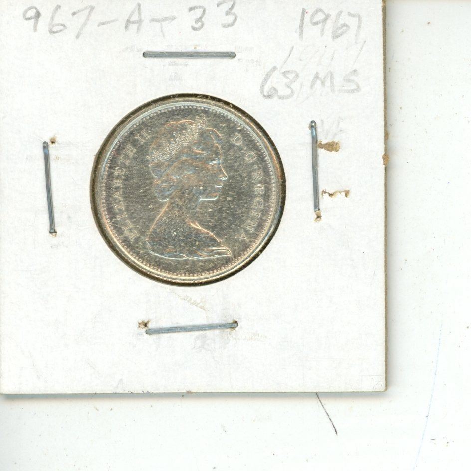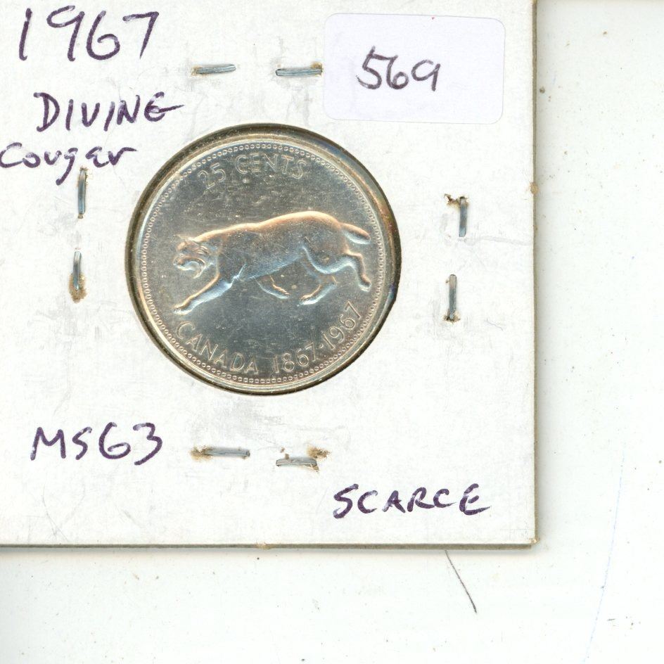 1967 Diving Bobcat Silver 25 Cents. There is a Rotated Die, so it looks like the Bobcat is Diving. MS-63. Scarce.