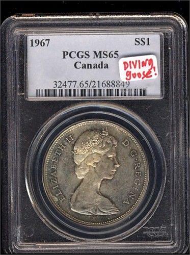1967 "Diving Goose" 10 degrees. $1 PCGS MS65PQ. Nicely toned. Scarce and very popular!