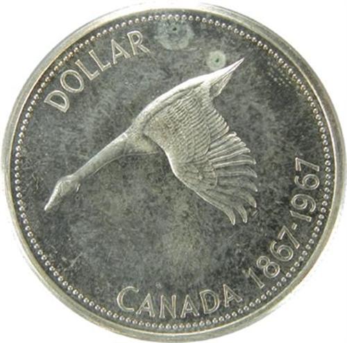 Canada Silver Dollar 1967 Diving Goose, ICCS MS-64. This is a strongly struck piece with great lustre on near flawless and near untoned surfaces. Tied fifth highest by ICCS