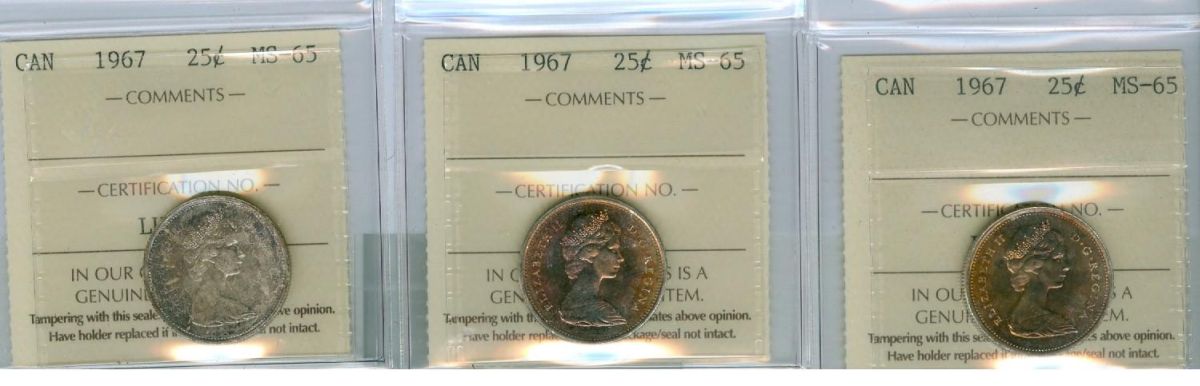 1967 Lot of 3 ICCS graded 25¢ coins, all MS65 and superbly