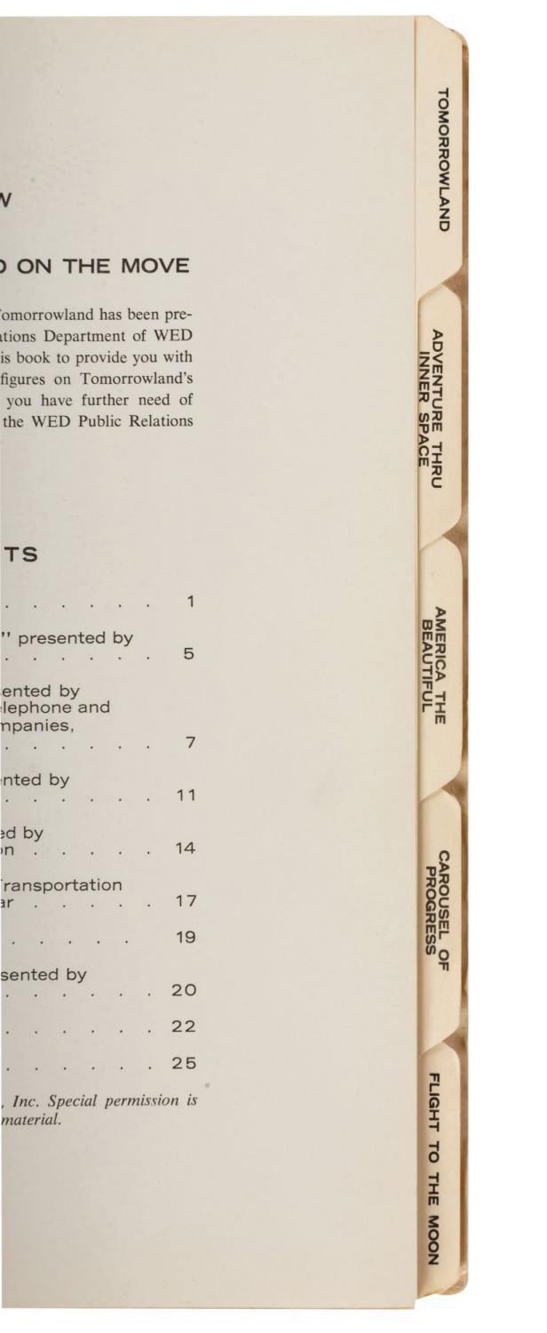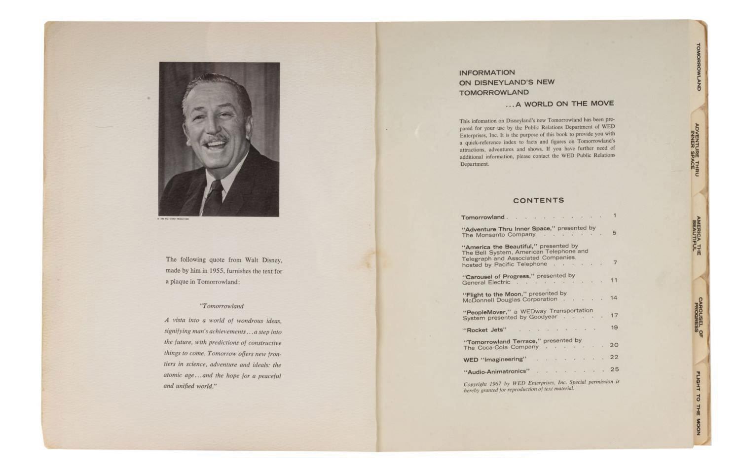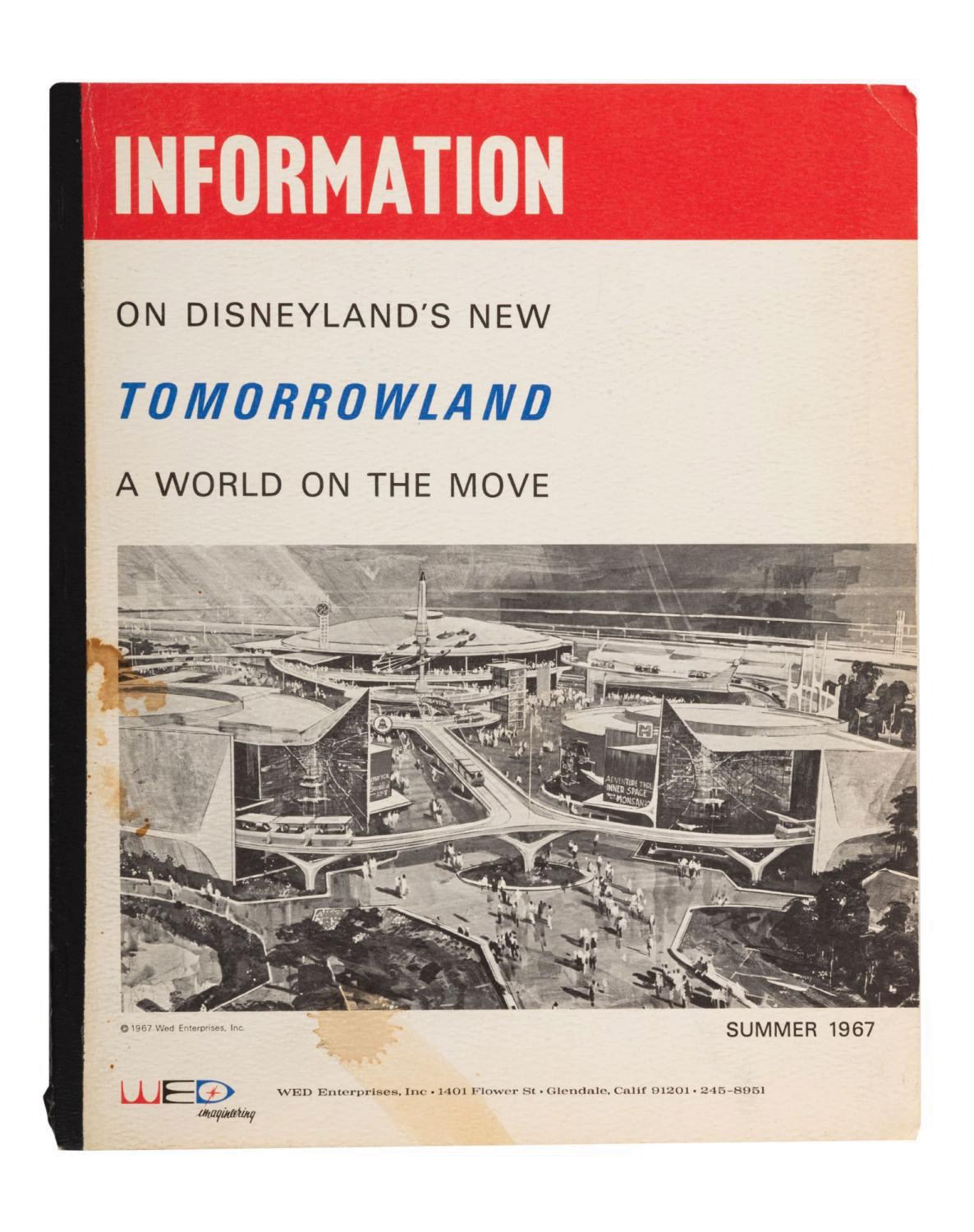 (Disneyland, 1967) A "Information on Disneyland's New Tomorrowland – A World on the Move" prepared for WED Imagineering by the Wed Enterprises, Inc. Public Relations Department for the summer of 1967. The bound document contains 25-pages of "facts and figures" relating to the massive 1967 expansion of Tomorrowland. Topics include the Adventure Through Inner Space, America the Beautiful, Carousel of Progress, and Flight to the Moon in addition to character elements of the land. Measuring 11"x9", the document is in good condition with slight spots of discoloration, creases, folds, and wear to the cover and pages throughout.