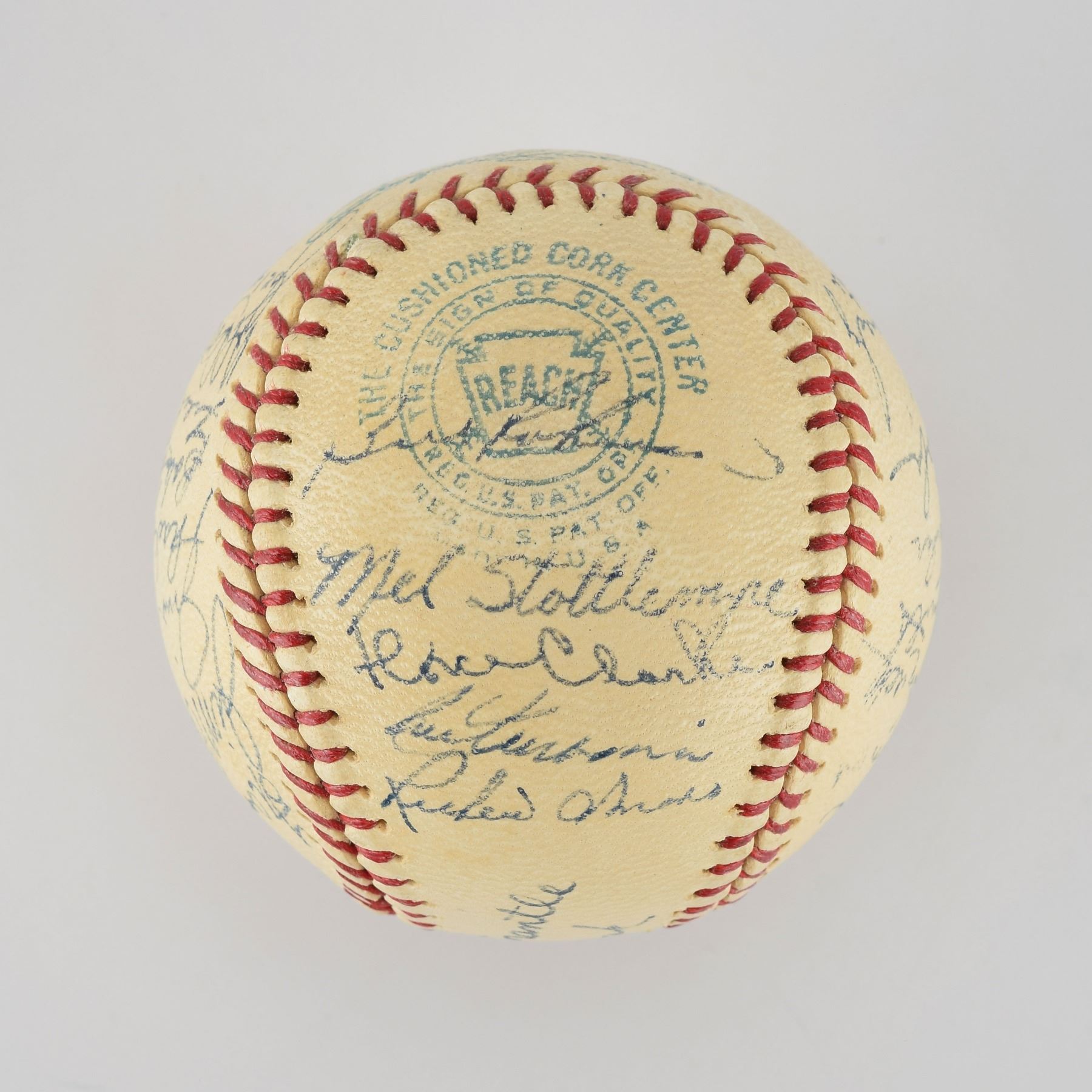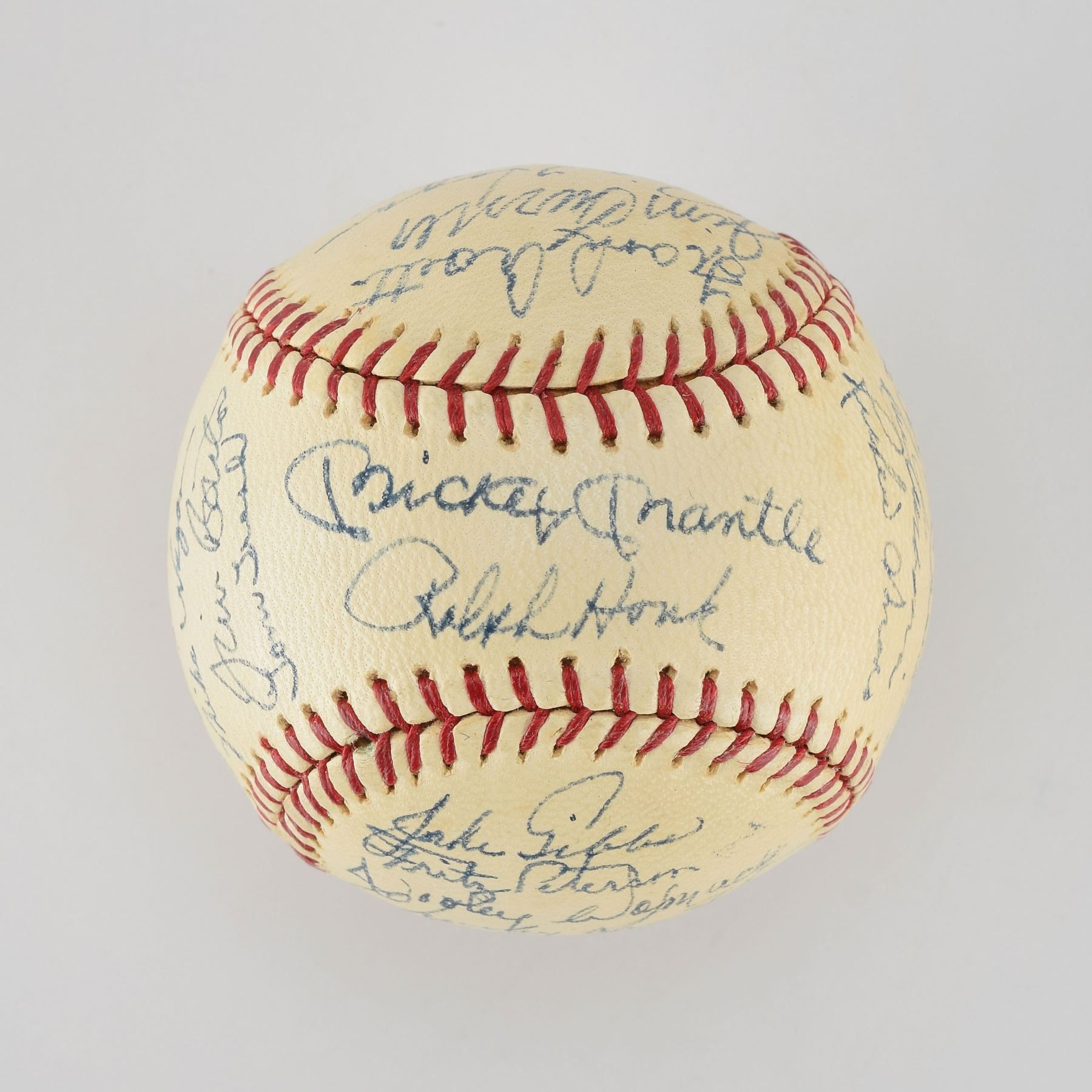 Offered is a HIGH GRADE 1967 New York Yankees team-signed baseball with 30 bold, blue ink signatures. This off-white OAL (Cronin) Reach ball, with very bold stampings, has been signed very boldly in blue ink by 30 members of the team, with ONE Hall of Famer—Mickey Mantle.