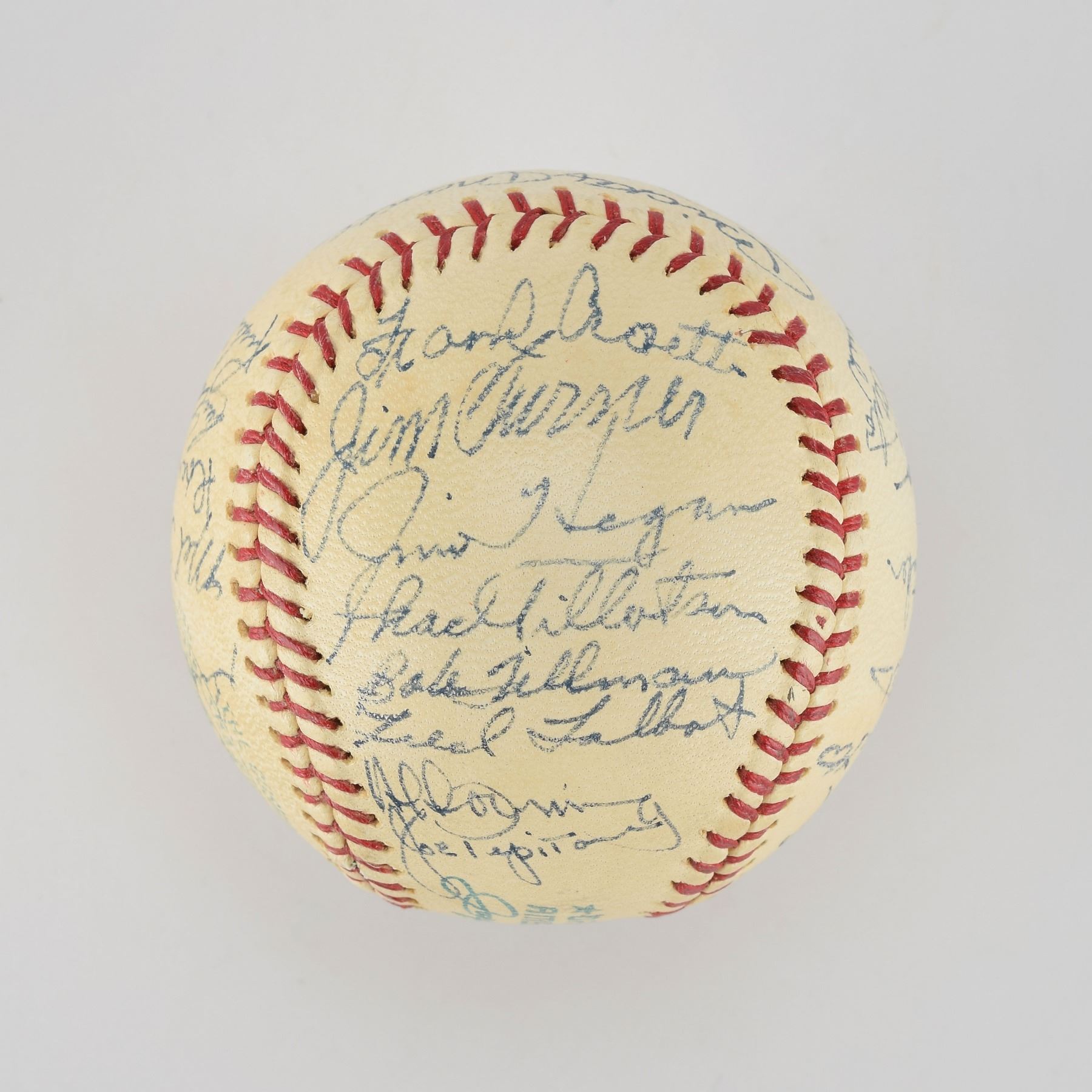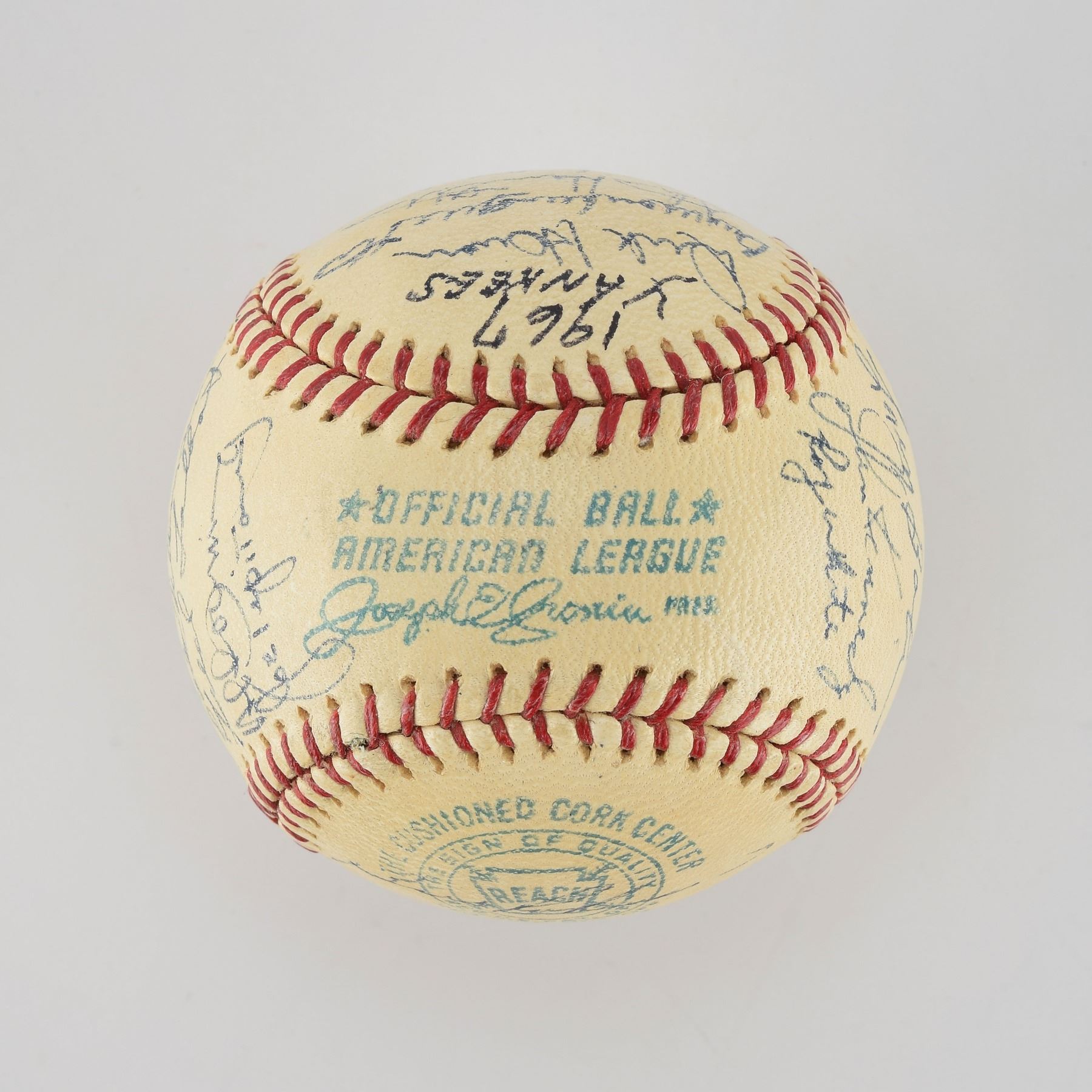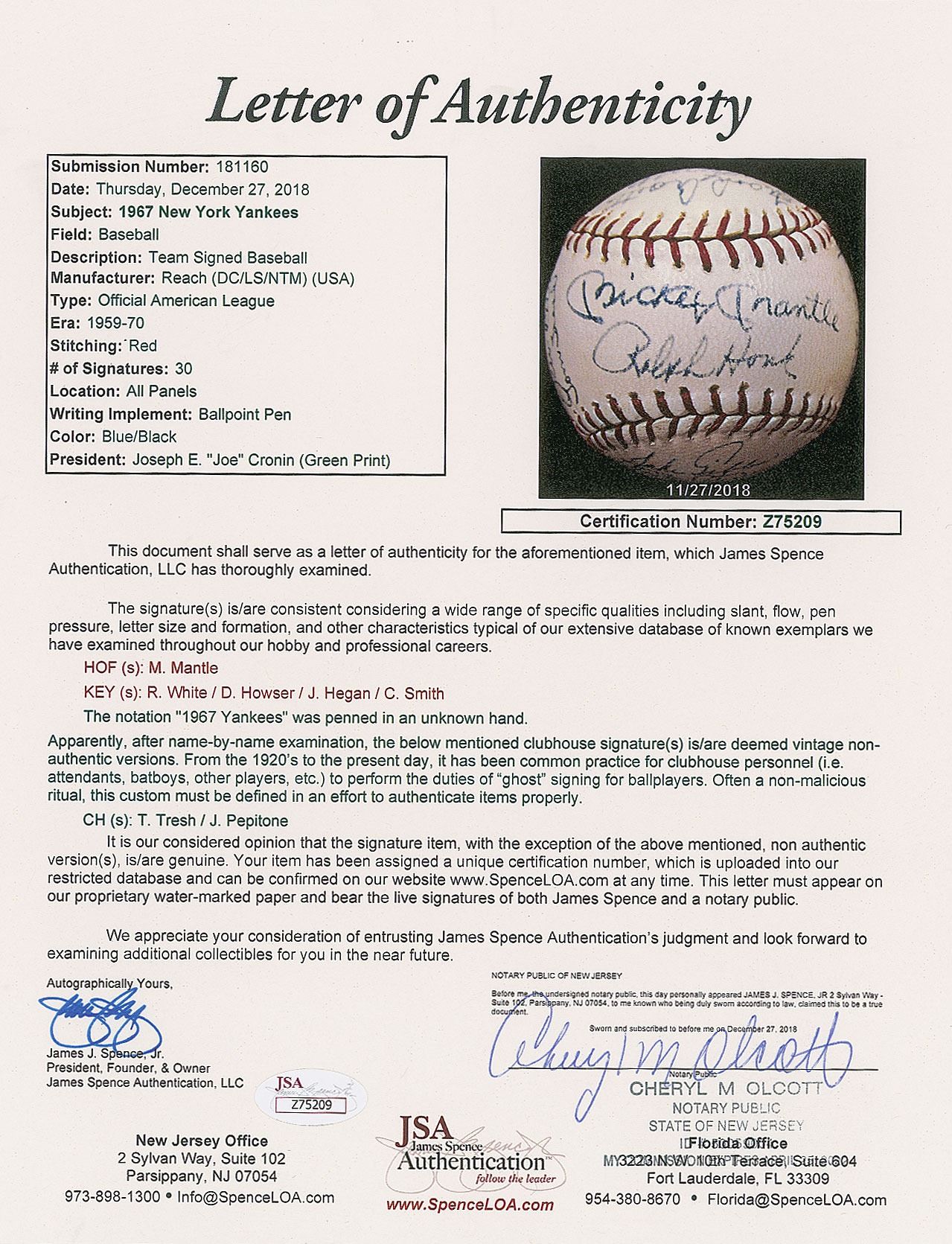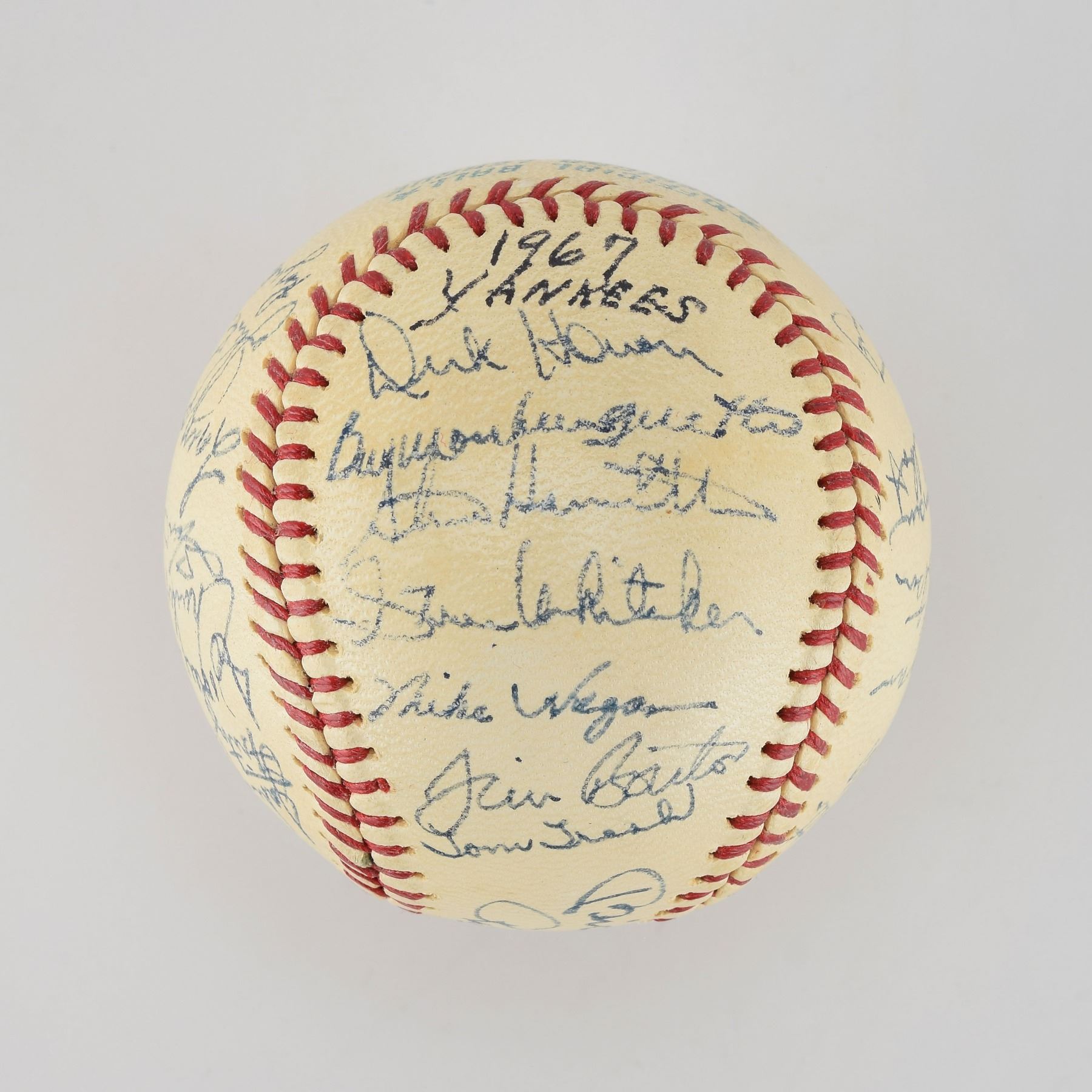 Signatures range in grade from ("8-9"). Overall a beautiful ball with extraneous markings of "1967 YANKEES" on the WEST panel, and a very light coat of shellac to preserve these signatures. PSA/DNA has determined the Pepitone and Tresh signatures are of the clubhouse variety. This is a high grade team-signed baseball from the 1967 New York Yankees team, a ball which was originally housed in a PSA/DNA NM+ sealed holder (cert. # 81468069), but had been removed by our consignor; the ball has been reevaluated by PSA/DNA for this auction.