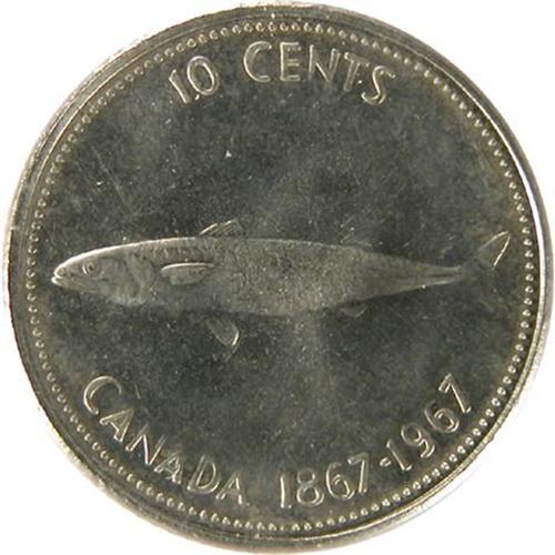 Canada Ten Cents 1967 Nickel Pattern, CH DC-33, ICCS AU-55. This piece received a weak strike across the Queen’s jaw and on the corresponding portion of the mackerel on the reverse, and this flatness of detail was likely the cause of the ICCS grade. It is, however, a fully lustrous piece with no evidence of wear and is Uncirculated to Choice Uncirculated. Regardless of grade, this is an extremely rare piece and is the only certified example by the major services. We previously sold this piece as Lot 920 in our CNA 2000 Auction
