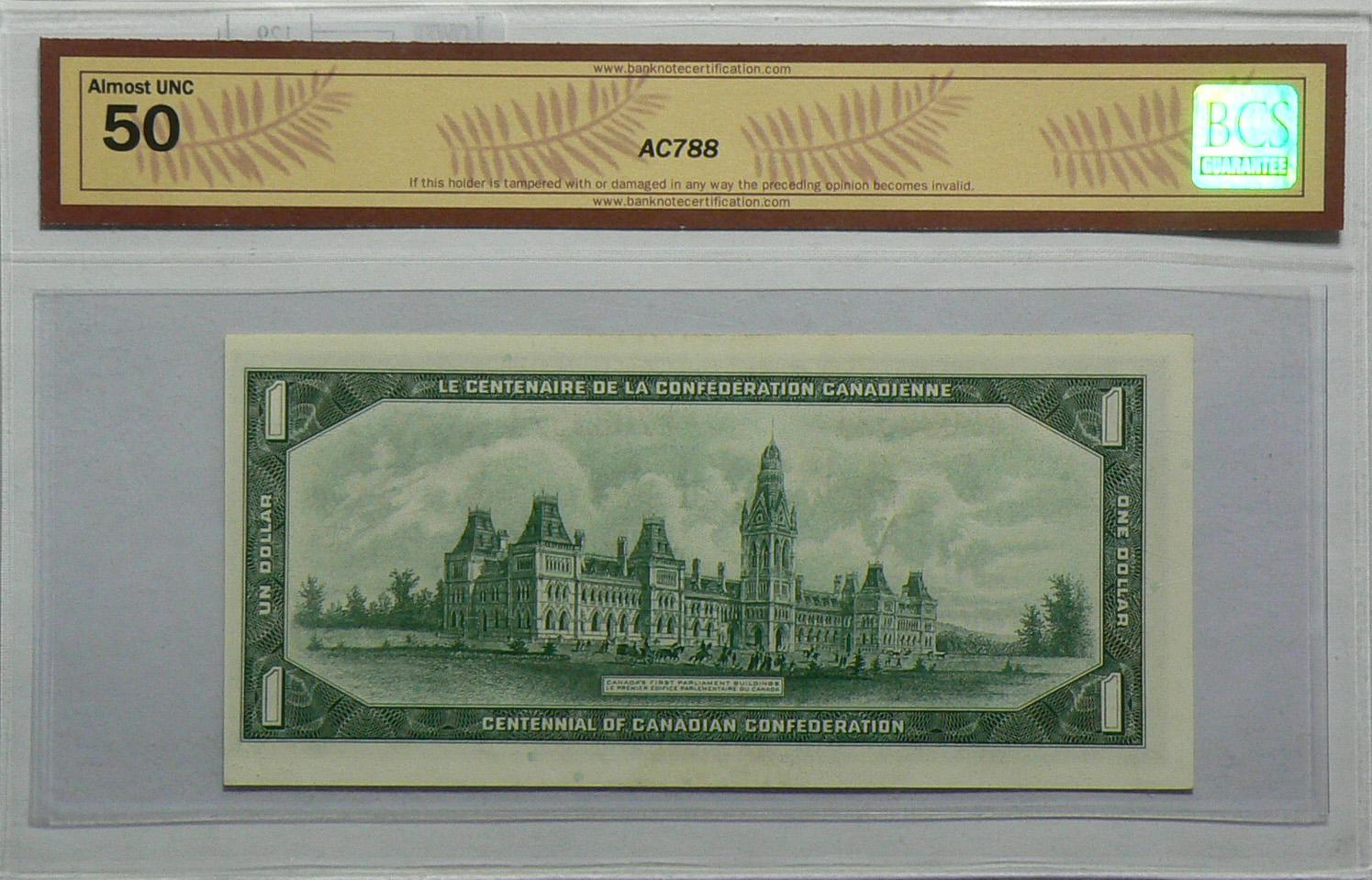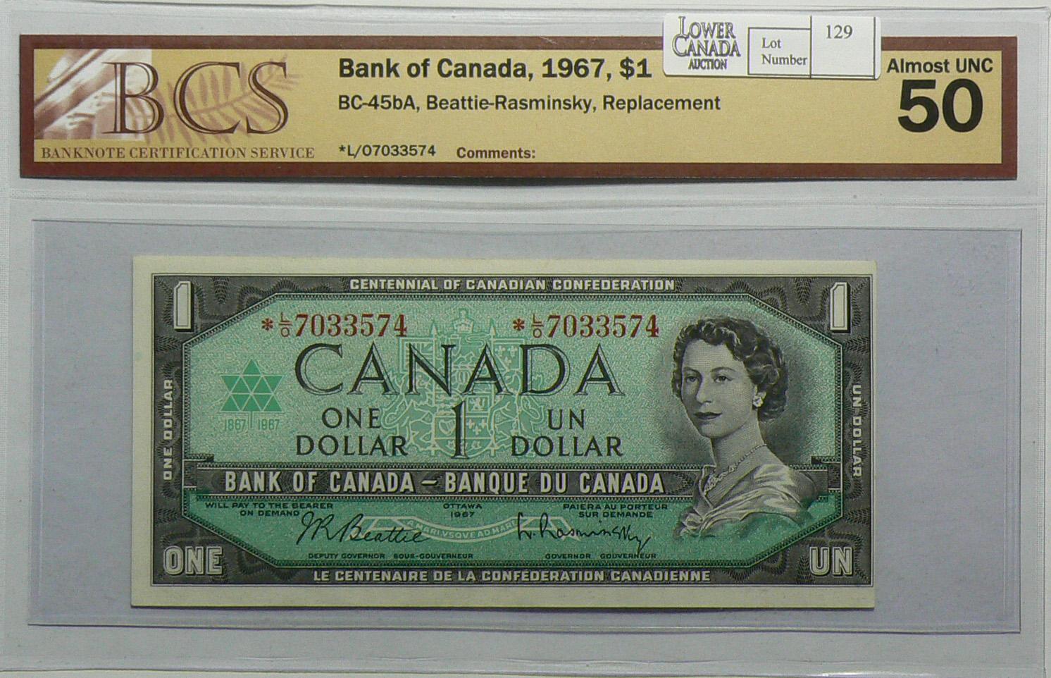 1967 One Dollars Replacement, BC-45bA, BCS AU-50, Beattie Rasminsky, serial *L/O7033574.
