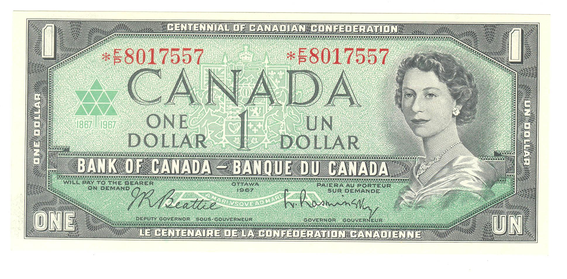 1967 One Dollars Replacement, BC-45bA, Choice UNC, Beattie Rasminsky, serial *F/P8017557.
