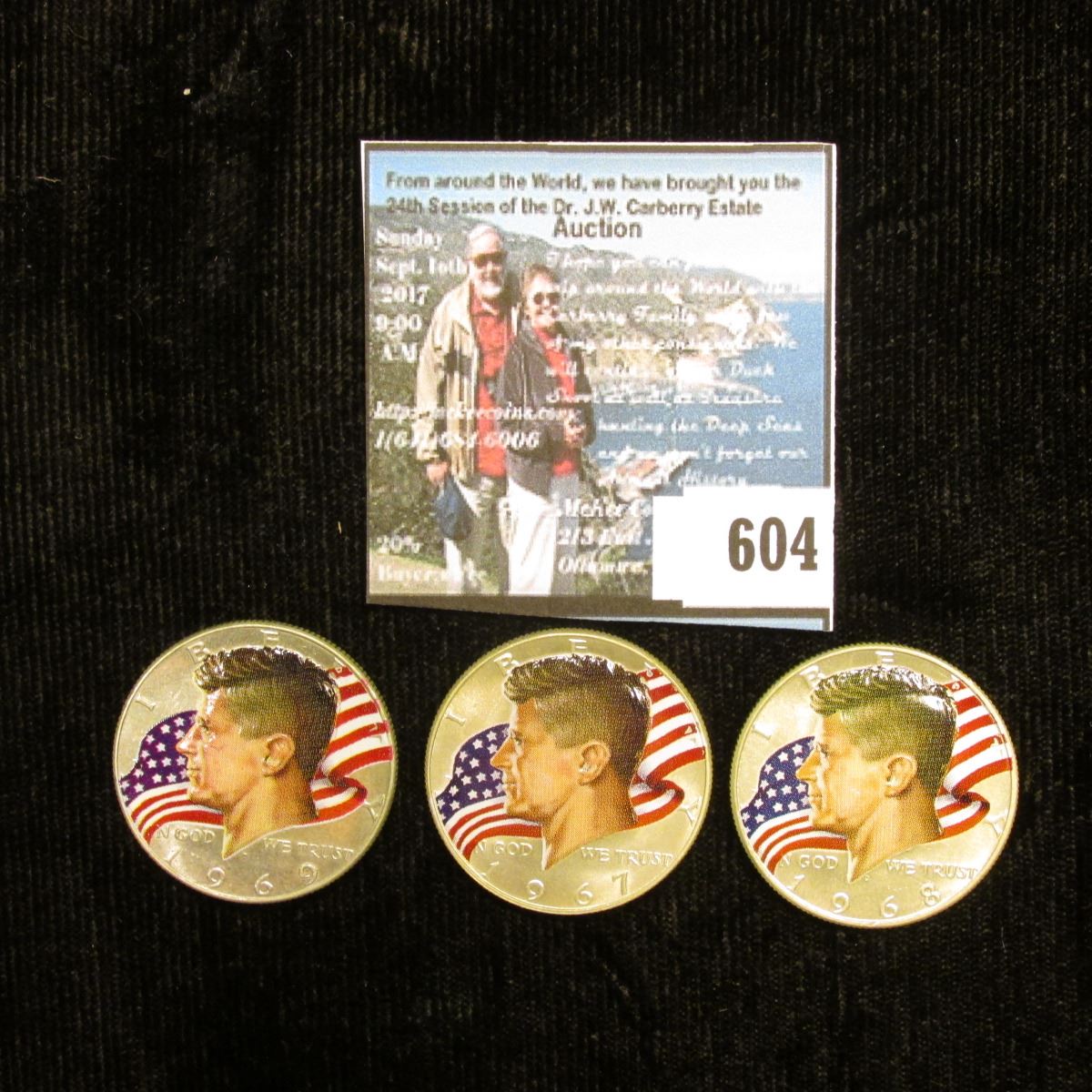 1967 P, 68 D, & 69 D 40% Silver Kennedy Half-Dollars, all three with enameled heads and flag in back
