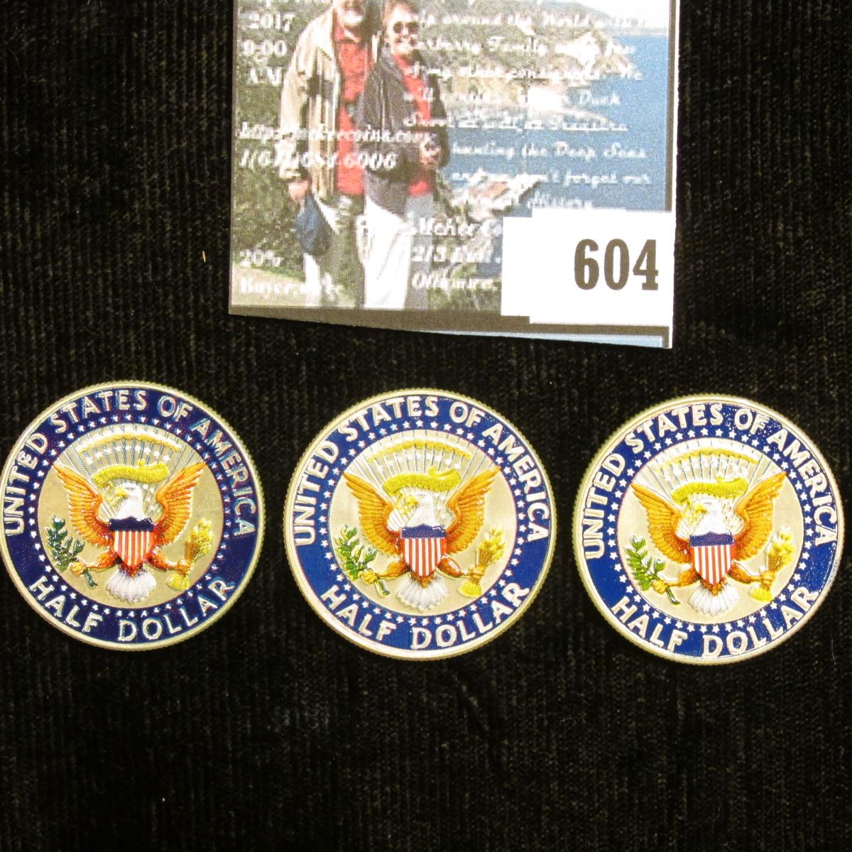 1967 P, 68 D, & 69 D 40% Silver Kennedy Half-Dollars, all three with enameled heads and flag in background, as well as certificates of authenticity.