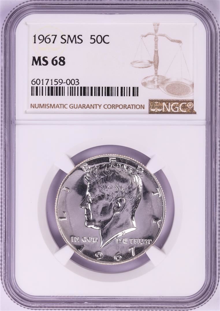 One 1967 SMS Kennedy Half Dollar Coin NGC MS68. NGC Certified.