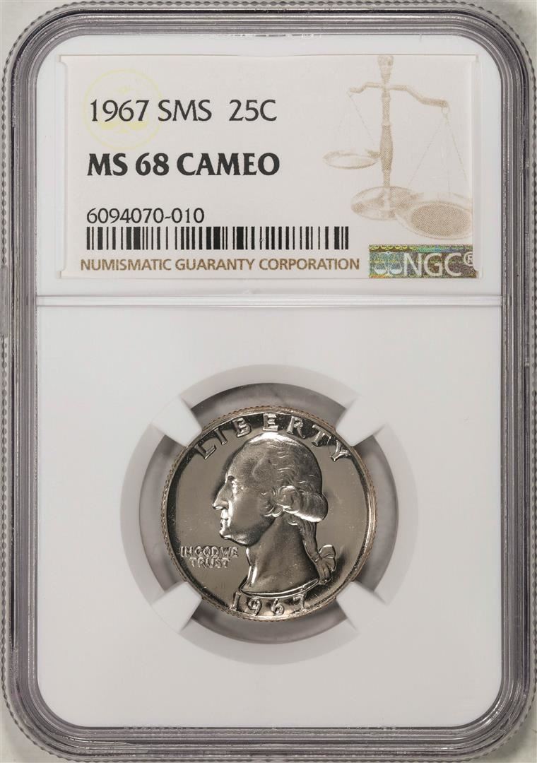 One 1967 SMS Washington Quarter Coin NGC MS68 Cameo. NGC Certified.
