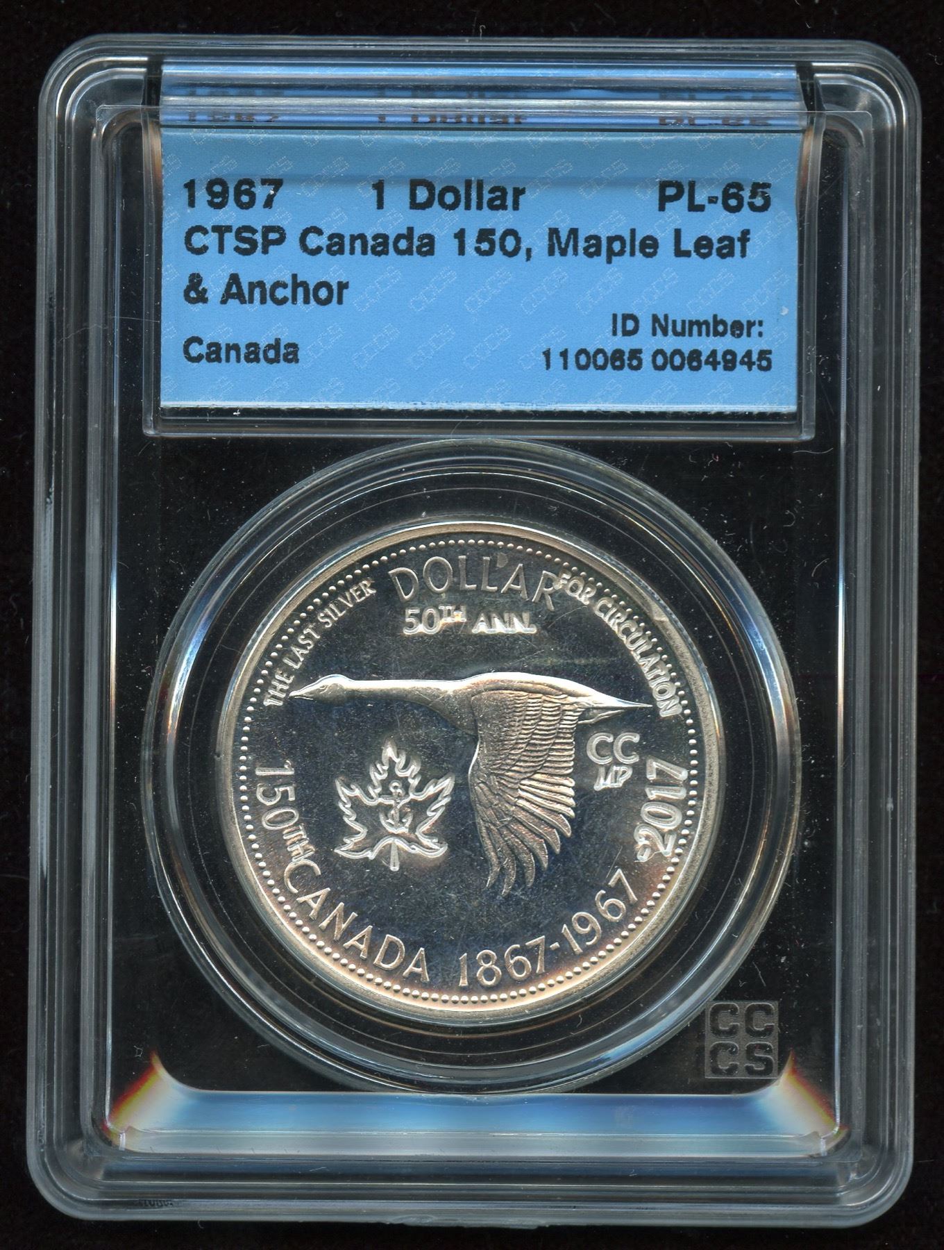 Representing the 150th Anniversary of Canada and its various events years ago. Commemorating the 50th Anniversary of the 1967 silver dollar with maple leaf and anchor. CCCS PL-65. Only 200 struck.