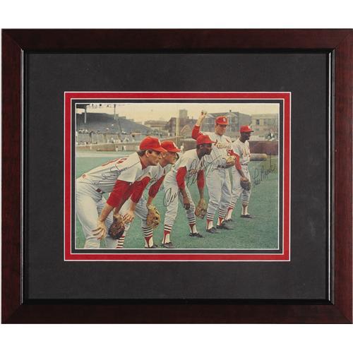 <B>1967 St. Louis Cardinals Signed Photograph with Maris, Flood, Brock.</B></I> What a line-up! Terrific color photo of pre-game warm-ups features a row of five superstar Cards, each having signed his own image in 10/10 blue ink. From left to right we find Mike Shannon, Roger Maris, Curt Flood, Tim McCarver and Lou Brock. A small tear at the right edge nips at Brock's signature, but does not distract the eye. Image measures 6x8" in size, and is professionally matted and framed in team colors to final dimensions of 11.5x14". <I>LOA from PSA/DNA. LOA from James Spence Authentication.</B></I><BR><BR><b>Shipping:</b> Flat Material, Small (<a target="_blank" href="http://www.heritageauctions.com/common/shipping.php">view shipping information</a>)