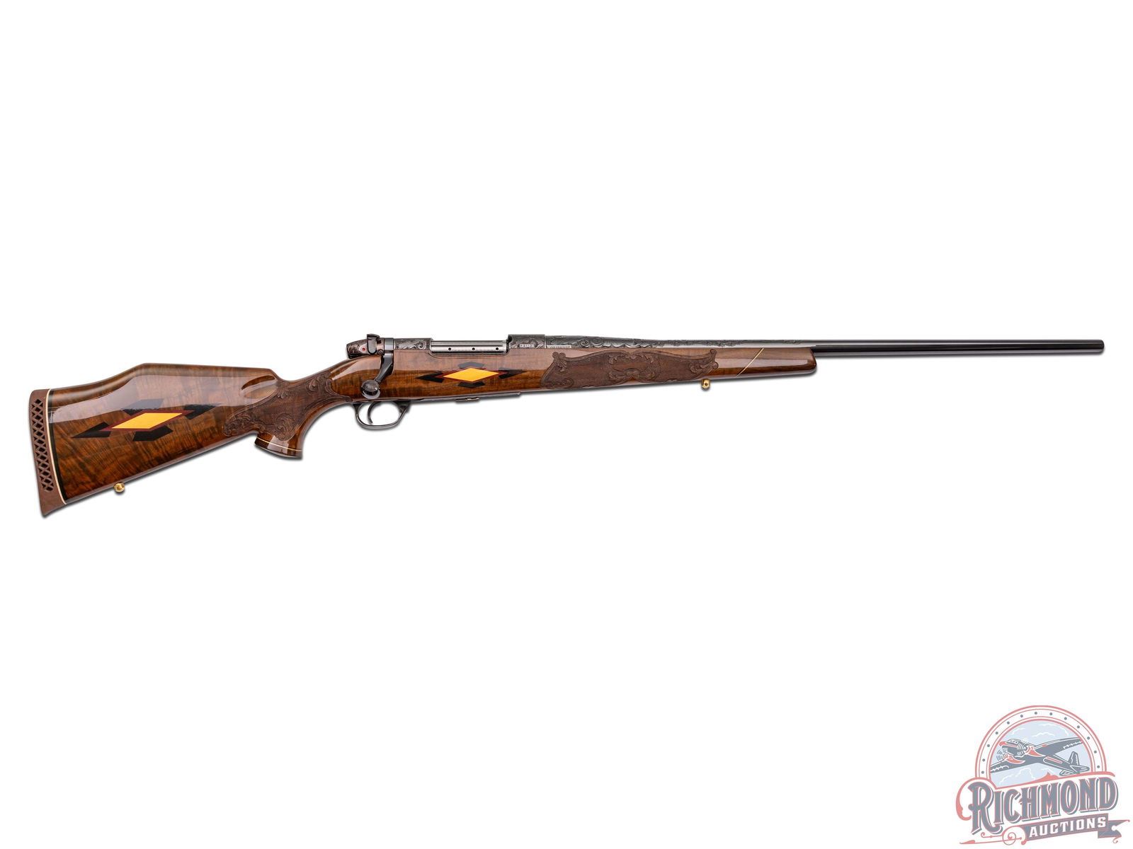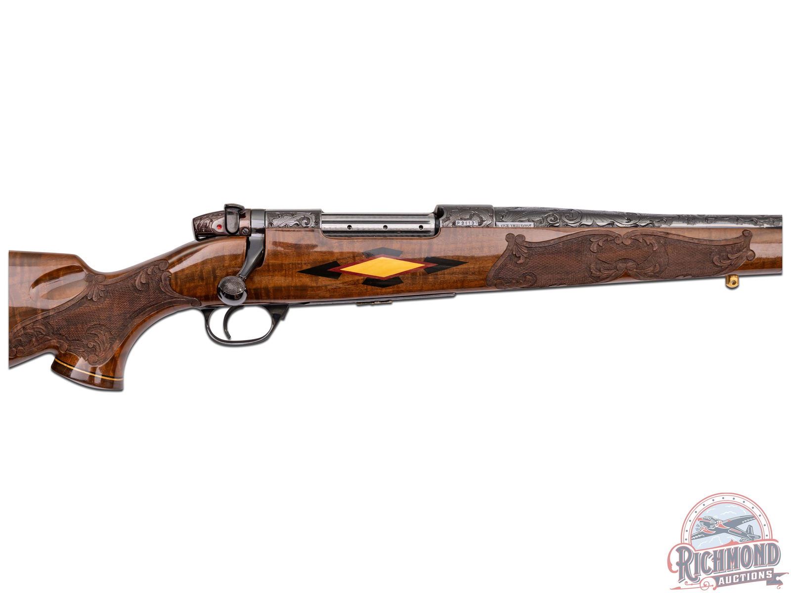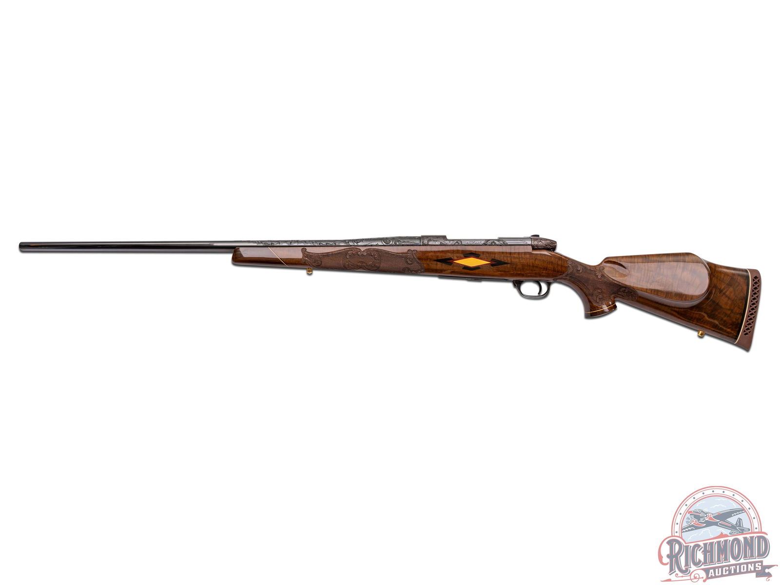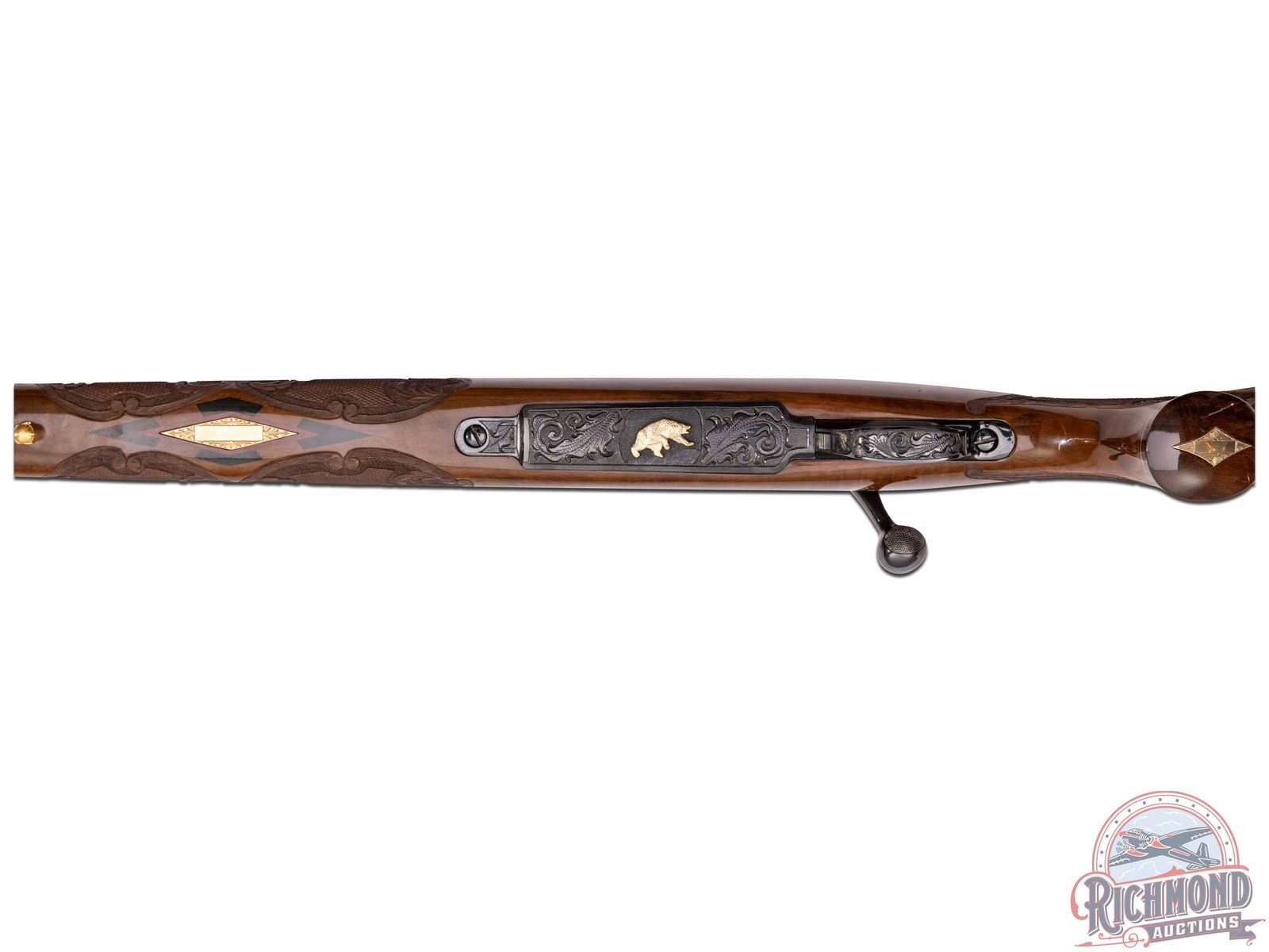 Custom made in West Germany in 1967 and South Gate custom shop engraved. Features a 26" blued sightless tapered barrel. Barrel has 40% coverage featuring floral scroll engraving that extends 11" from receiver. Receiver has matching engraving with 80% coverage. Top of the receiver is drilled for scope mounts. Blued floorplate has 85% coverage with a gold embossed roaring Grizzly bear. Two position safety with jeweled bolt and follower and knurled bolt knob. Engraved trigger guard with serrated trigger. Heavy grain factory Weatherby walnut Monte Carlo style stock with contrasting dark walnut forearm tip and pistol grip cap. Pistol grip features a gold engraved diamond shaped inlay. Deep relief factory carved stock featuring a floral scroll pattern border with diamond checkered centers. Bottom of foregrip and both sides of the receiver feature a diamond tri-wood inlay consisting of bony, rosewood and birch. Bottom of the forearm inlay features a gold engraved inlaid plate. Right side of the stock has a larger, matching tri-wood inlay. Factory gold plate sling studs. Fitted with a Weatherby brown ventilated recoil pad. Includes Weatherby factory paperwork stating upgrades done in 1988 totaling over $3,700. LOP: 13-1/2". CALIBER: 30-06 SPRG. S/N: P21137. FFL STATUS: Curio & Relic.
