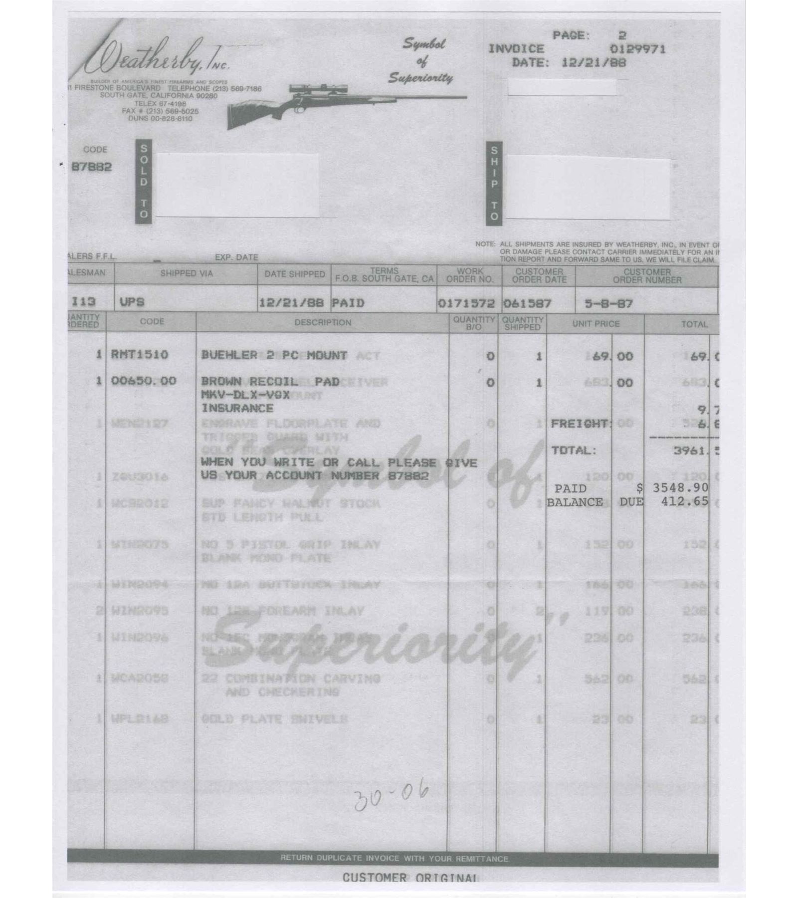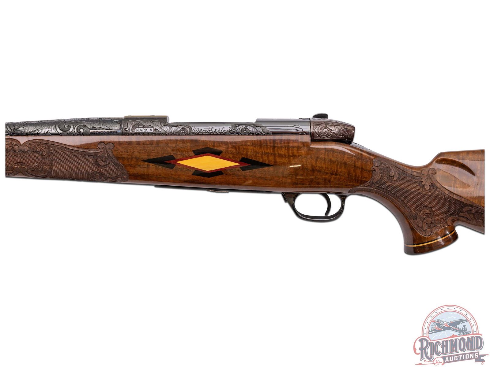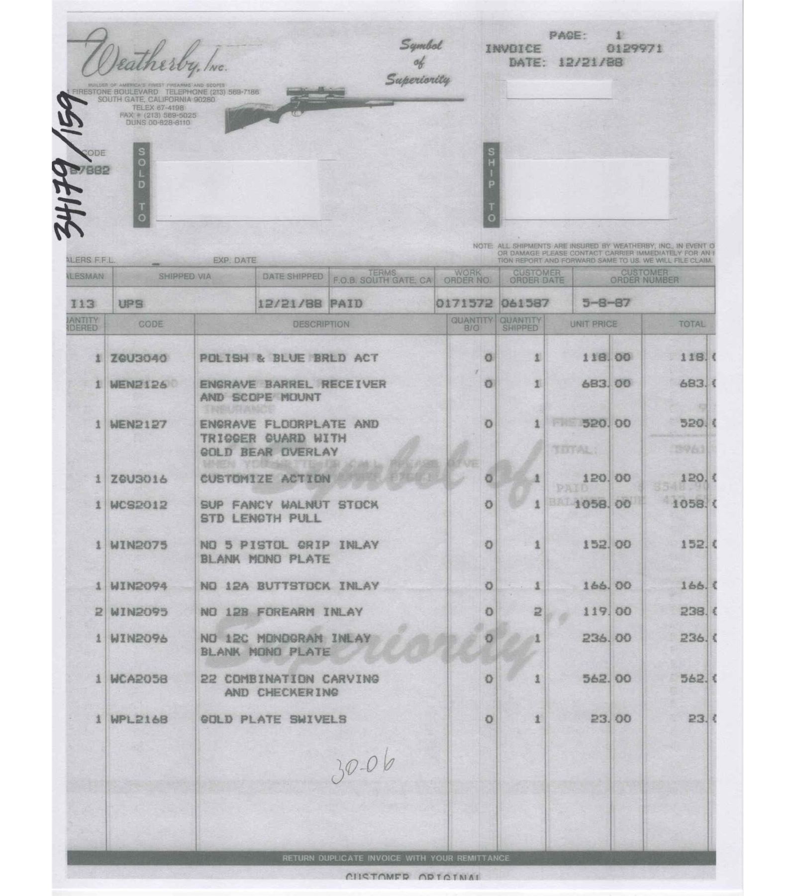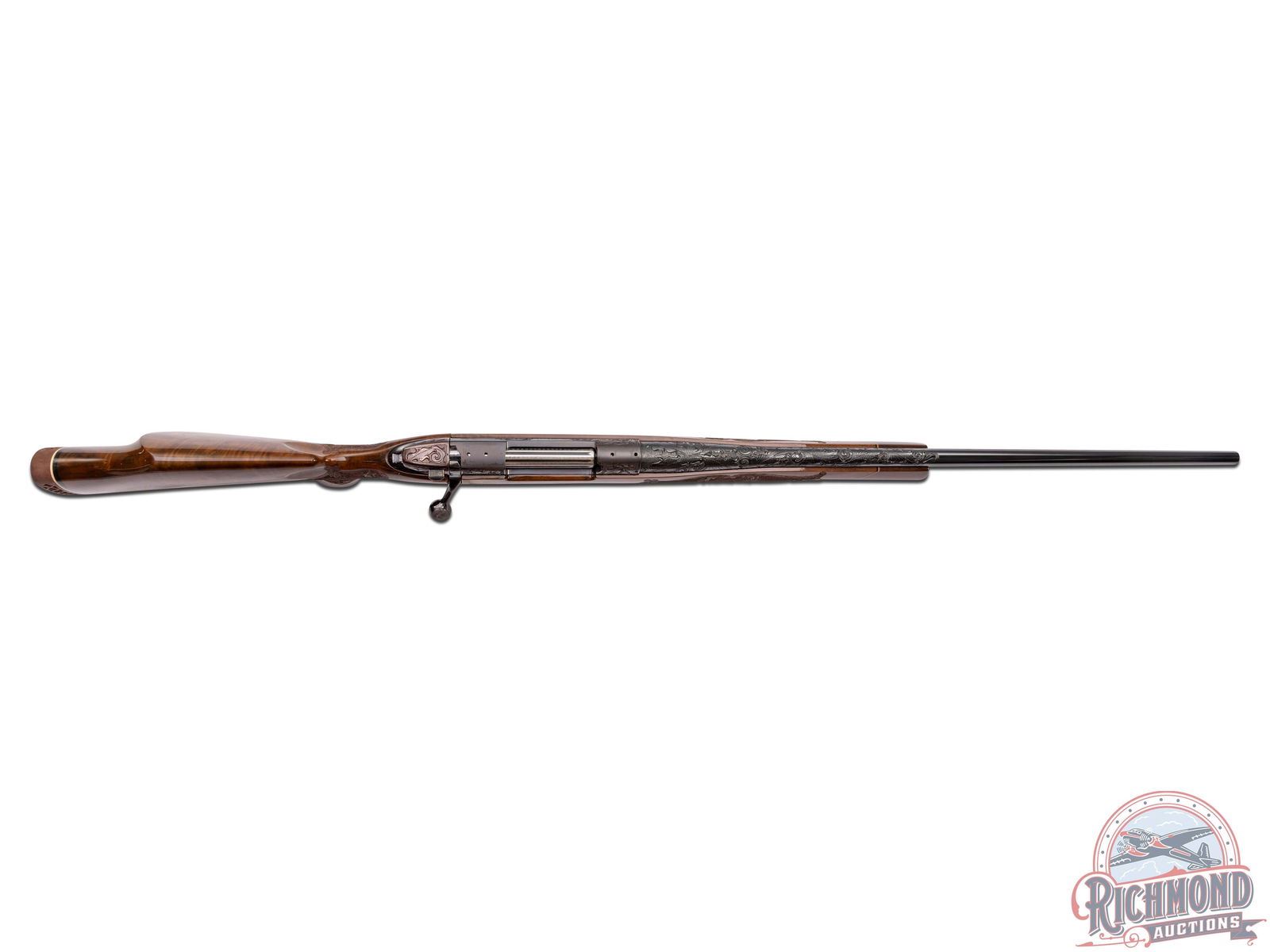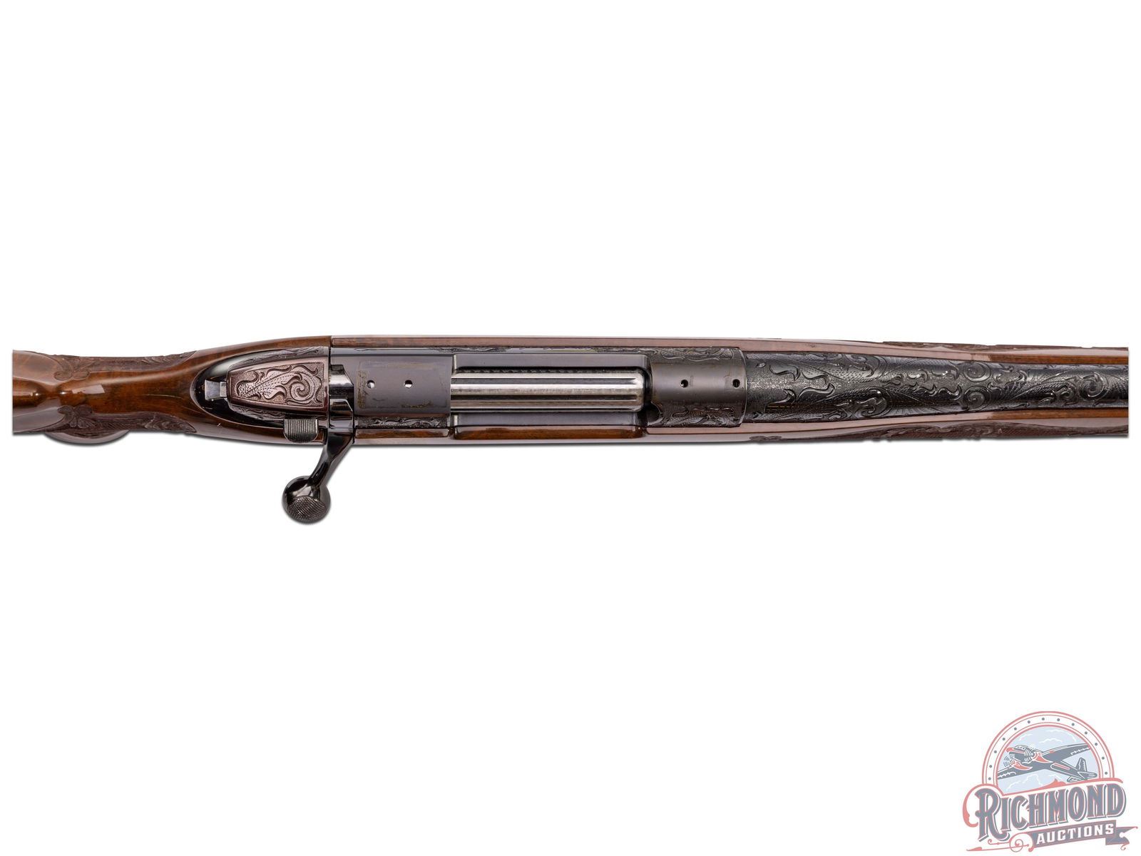 Custom made in West Germany in 1967 and South Gate custom shop engraved. Features a 26" blued sightless tapered barrel. Barrel has 40% coverage featuring floral scroll engraving that extends 11" from receiver. Receiver has matching engraving with 80% coverage. Top of the receiver is drilled for scope mounts. Blued floorplate has 85% coverage with a gold embossed roaring Grizzly bear. Two position safety with jeweled bolt and follower and knurled bolt knob. Engraved trigger guard with serrated trigger. Heavy grain factory Weatherby walnut Monte Carlo style stock with contrasting dark walnut forearm tip and pistol grip cap. Pistol grip features a gold engraved diamond shaped inlay. Deep relief factory carved stock featuring a floral scroll pattern border with diamond checkered centers. Bottom of foregrip and both sides of the receiver feature a diamond tri-wood inlay consisting of bony, rosewood and birch. Bottom of the forearm inlay features a gold engraved inlaid plate. Right side of the stock has a larger, matching tri-wood inlay. Factory gold plate sling studs. Fitted with a Weatherby brown ventilated recoil pad. Includes Weatherby factory paperwork stating upgrades done in 1988 totaling over $3,700. LOP: 13-1/2". CALIBER: 30-06 SPRG. S/N: P21137. FFL STATUS: Curio & Relic.