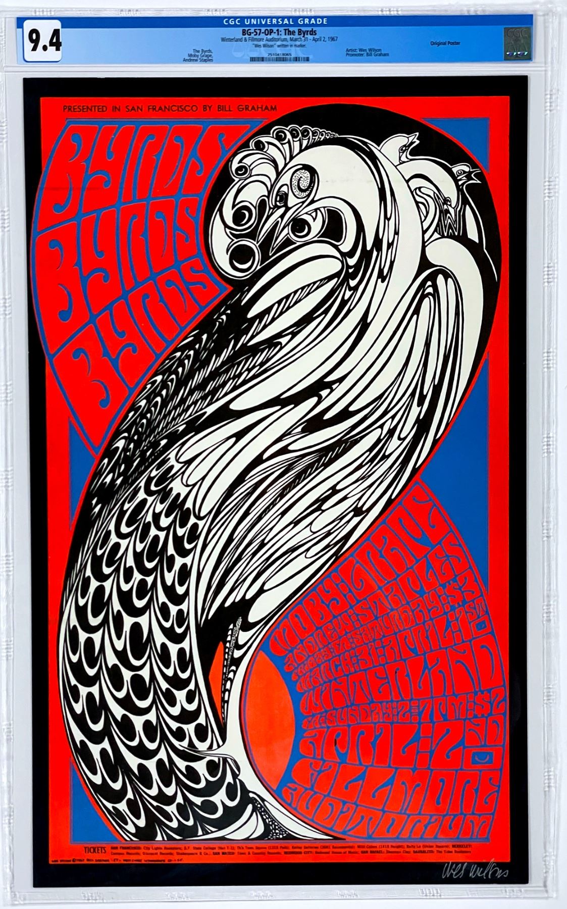 The Byrds concert poster promoting their shows on March 31 - April 2, 1967, at San Francisco's Winterland and Fillmore Auditoriums. The shows also featured Moby Grape and Andrew Staples and were promoted by Bill Graham. The first printing poster is signed by artist Wes Wilson.