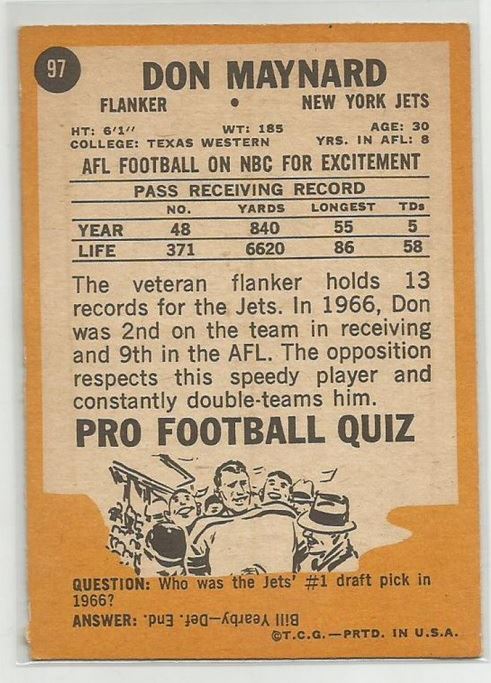 This Vintage 1967 Topps Football Don Maynard Card is in Very Good Condition.