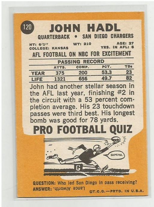 This Vintage 1967 Topps Football John Hadl Card is in Excellent Condition.