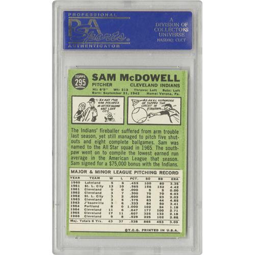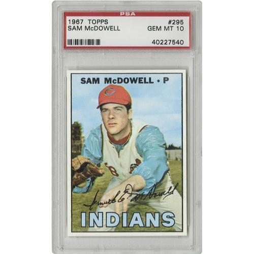 <B>1967 Topps Sam McDowell #295 PSA Gem Mint 10.</B></I> An absolutely perfect Gem Mint card from Topps' 1967 issue. A scarce find indeed -- less than one per cent of all '67 Topps cards slabbed by PSA get to wear the Gem Mint tag, with this being the sole flawless Sam McDowell on record to date. <BR><BR><B>Important notice:</B> Heritage usually auctions material at the rate of 200-250 lots per hour. On some occasions eBay Live bid software or the Internet may not be able to keep up with the pace of the auction. We recommend placing a realistic absentee bid now as insurance to avoid disappointment. Occasionally the auctioneer may eliminate or reject an eBay Live bid, and the auctioneer may also reopen a lot after the close of the eBay live bidding (usually because we missed an audience bid), and may reject your bid even if it shows you as the winning bidder. By bidding via eBay Live, you agree that Heritage may award the lot to another bidder at its sole discretion under the circumstances described above or any other reasonable circumstances. Since eBay bids are not shown to us until we open the lot on the floor, we treat those bids just like floor bids. In most cases the floor responds before the eBay bid is presented to us, due to Internet lag time, so for consistency we have made it a policy that floor bids are always considered first over tie eBay live bids. Also please note that all Heritage lots purchased through eBay Live carry a 22.5% Buyer's Premium. Please make sure you read the Terms and Conditions before you bid. This lot is being auctioned in conjunction with a live floor auction by Heritage Galleries & Auctioneers. All final auction and invoice information will be supplied by Heritage Galleries & Auctioneers, and all other information should be considered preliminary. Lot:19617 <BR><BR><B>Winning Notification and Billing:</B> After the FINAL session in this auction is complete, Heritage will send e-mail and snail mail invoices. This process normally takes several days. All final auction and invoice information will be supplied by Heritage Galleries & Auctioneers, and all other information should be considered preliminary. <BR><BR>This auction will be conducted on a live auction floor and over the Internet through eBay Live. If you choose to place an absentee bid, please take a moment to <font color='#0000ff'><u><a href='http://pages.ebay.com/liveauctions/help/before/laabsentee.html'>learn how eBay Live absentee bidding works</a></u></font><font color='#000000'>