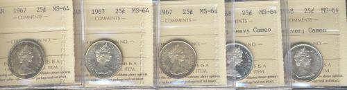 1967 x 3 & 1968 ICCS MS64 Cameo 25¢. Lot of 5 coins all great examples.