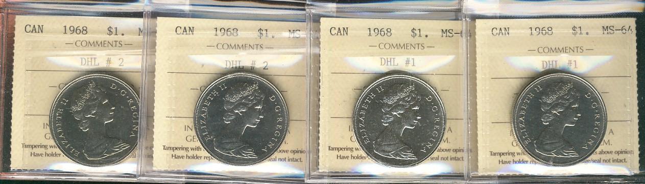1968 $1 DHL#1 & DHL#2 ICCS MS64. Lot of 4 coins, two of each type.