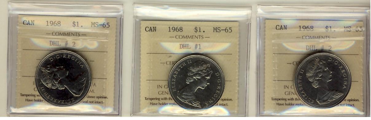1968 $1 DHL#1 & DHL#2 ICCS MS65. Lot of 3 coins, two type #2's.
